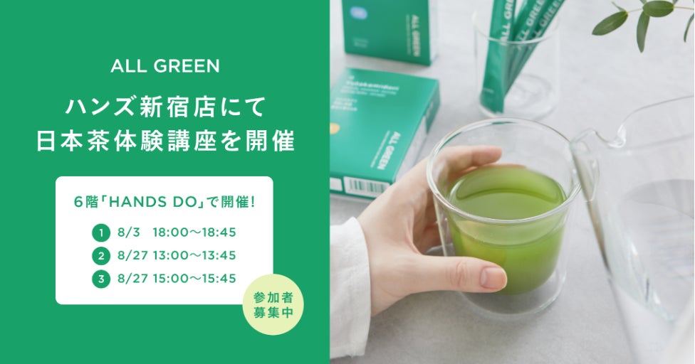 株式会社ゼロワンブースター(本社:東京都千代田区、代表取締役:合田ジョージ、 以下01Booster)が販売する、シングルオリジン・ティーの栄養を丸ごとおいしく飲める緑茶「ALL GREEN」は、ハンズ新宿店6階体験スペース「HANDS DO」にて、2024年8月3日(土)・27日(火)にワークショップを開催します。
