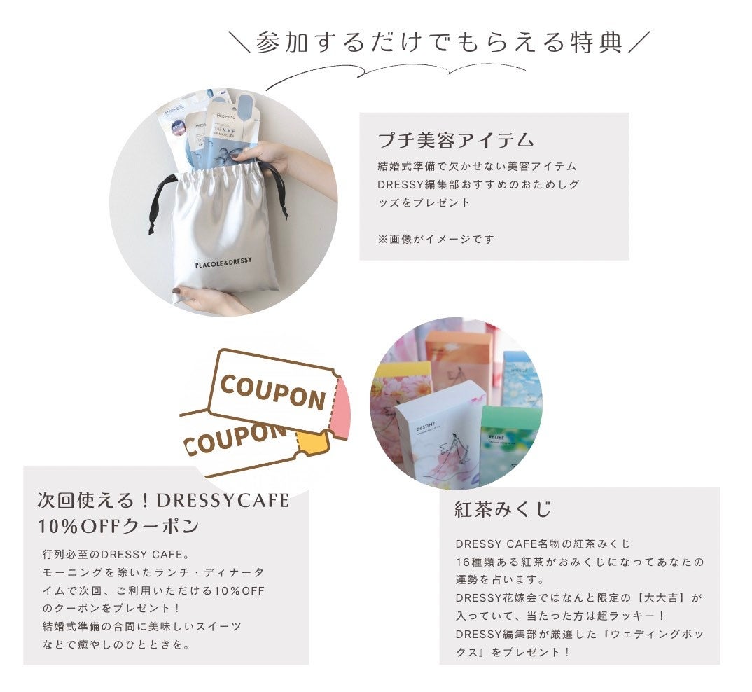 プレ花嫁さまに、参加するだけでもらえる豪華特典をプレゼントいたします。これからの結婚式準備の束の間のひとときに癒しとステキな時間を過ごしていただきたいと思い、3つの特典をご用意いたしました。