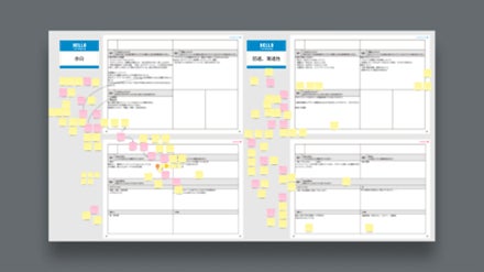 「NUTION」はフルリモート組織のため、今回のワークショップはオンラインホワイトボードツール上で実施しました。これらのデジタルコラボレーションにより、発表者のワークシートとネームカード、またそれに対する質問やコメント、コミュニケーションの軌跡が一つのキャンバスに描かれ、発表者が「後で振り返ってみたい」と思うアウトプットが生まれました。