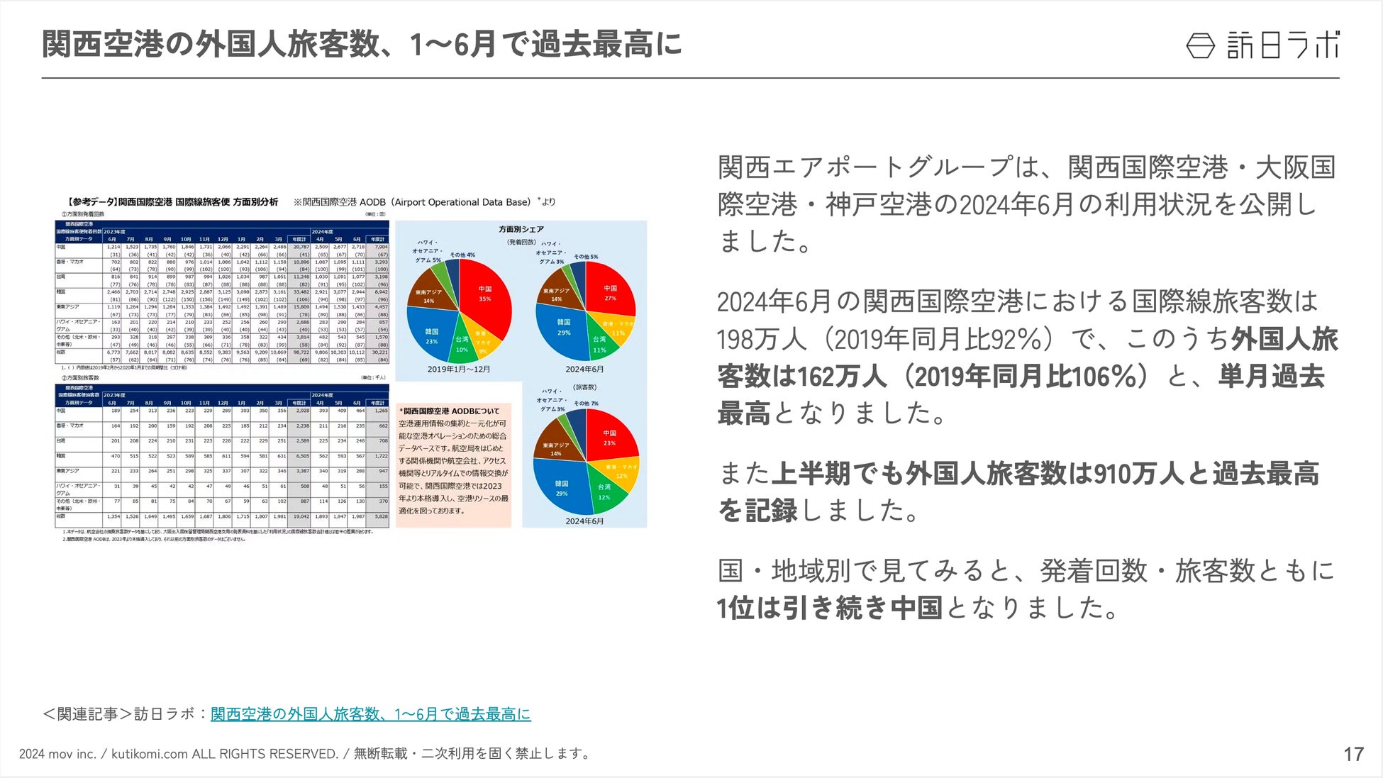 関西空港の外国人旅客数、1〜6月で過去最高に:観光・インバウンドの最新動向がわかる!インバウンド情報まとめ「2024年8月前編」を訪日ラボが公開