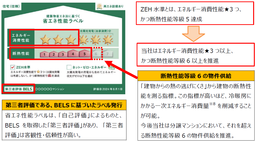 当社では、2022年11月以降に着工した分譲マンションについては原則ZEH水準を達成しており、そのうち、約7割※7は併せて低炭素建築物認定も取得しております。また、今までの環境に配慮への取組みに加え、今後2024年4月以降に建築確認申請を行う物件については、省エネ性能を示す第三者評価であるBELSによる省エネ性能ラベルを全物件住棟評価で掲載することや、断熱性能等級6の物件供給を推進していく方針を策定しました。