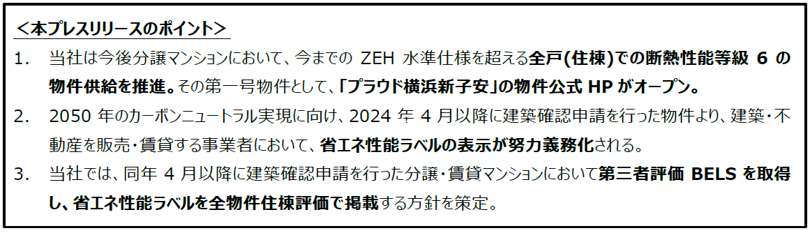 断熱性能等級6の物件推進に対応する当社の第一号物件として、「プラウド横浜新子安」の公式HPがオープンいたしました。本物件の主な特徴は以下の通りです。