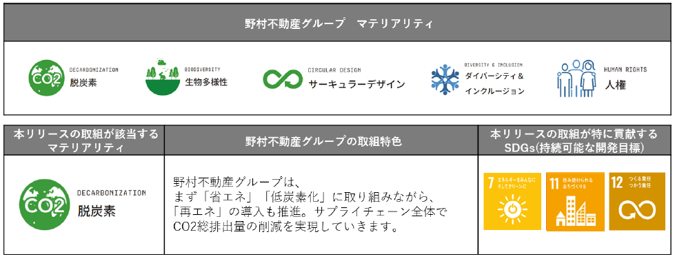 野村不動産グループの重点目標(マテリアリティ)を国連のSDGs(持続可能な開発目標)に当てはめて整理しております。サステナビリティの取組み詳細は以下をご確認ください。(https://www.nomura-re-hd.co.jp/sustainability/)