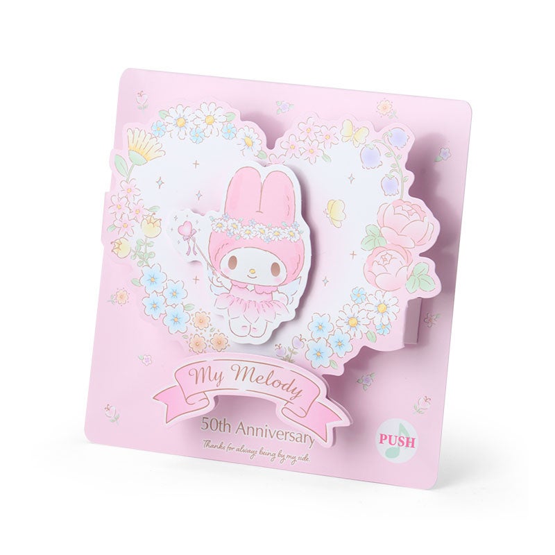 マイメロディ50thアニバーサリーショップでは、限定グッズ発売にあわせて、限定ノベルティも登場。期間中、アニバーサリーショップ開催店舗・サンリオオンラインショップ本店でお買い物をされたお客様にマイメロディからの「メッセージボイス入りカード」をプレゼントします。
