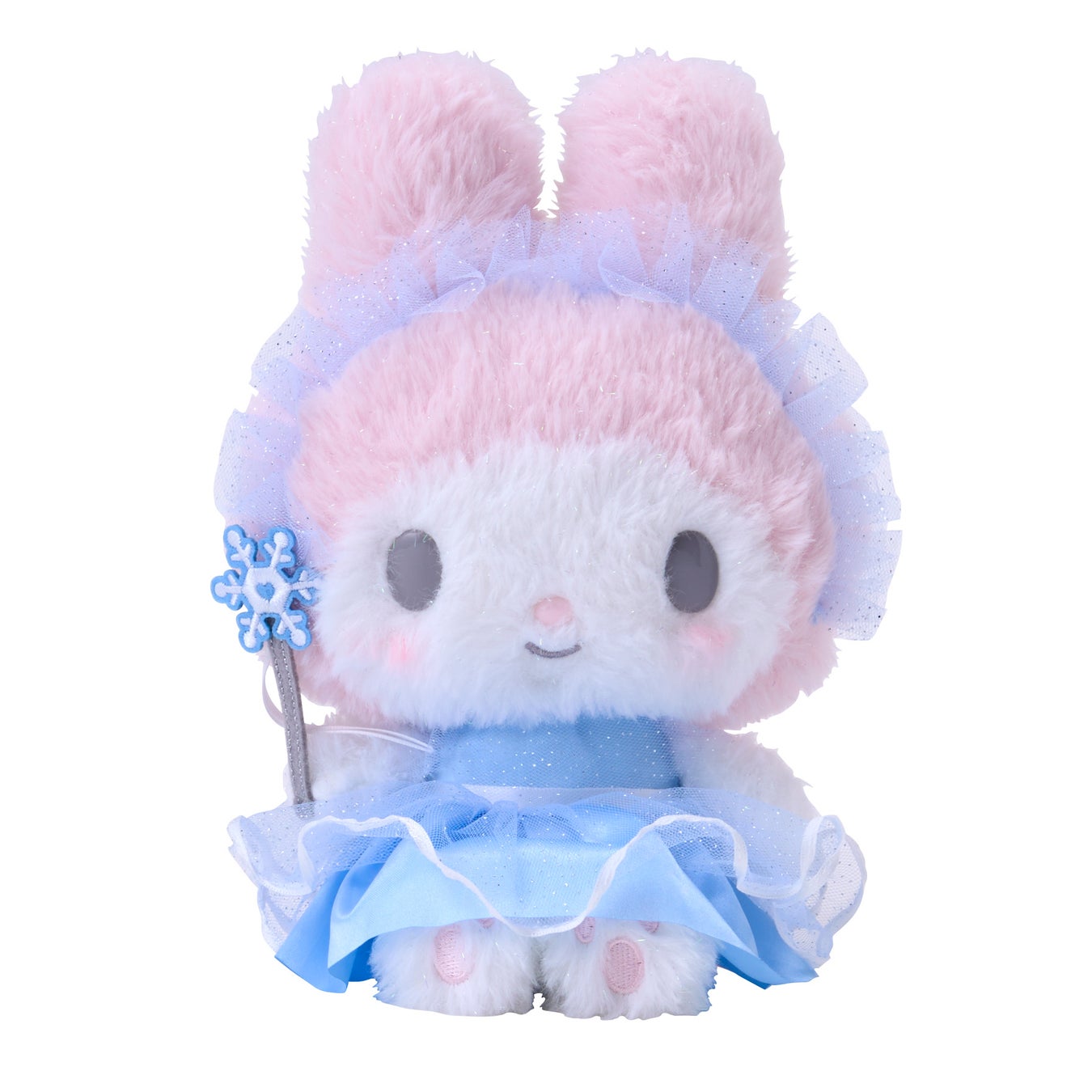 フェアリーに変身したマイメロディとマイスウィートピアノのぬいぐるみです。華やかなラメ入りのボア生地を使用しているほか、フェアリーらしい透け感のある素材やフリルも使用。50周年記念のネーム付き。