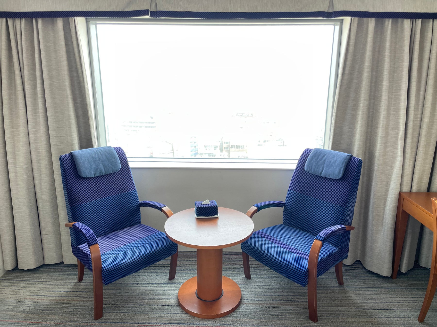 た内装です。  窓からは小倉駅を運行する様々な列車を眺めることができます。