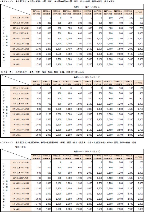 なお、燃油特別付加運賃は、シンガポールケロシン市況価格および為替レートの変動に応じて、 1ヶ月毎に見直しております。