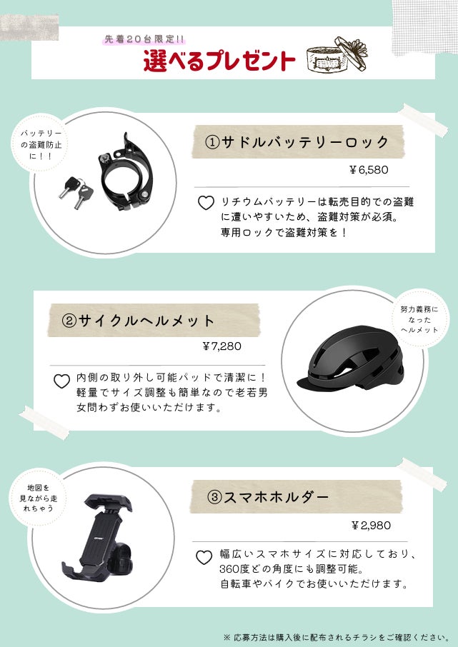 以下の3つのプレゼントから1つをお選びいただきます ① サドルバッテリーロック ② サイクルヘルメット ③ スマホホルダー |