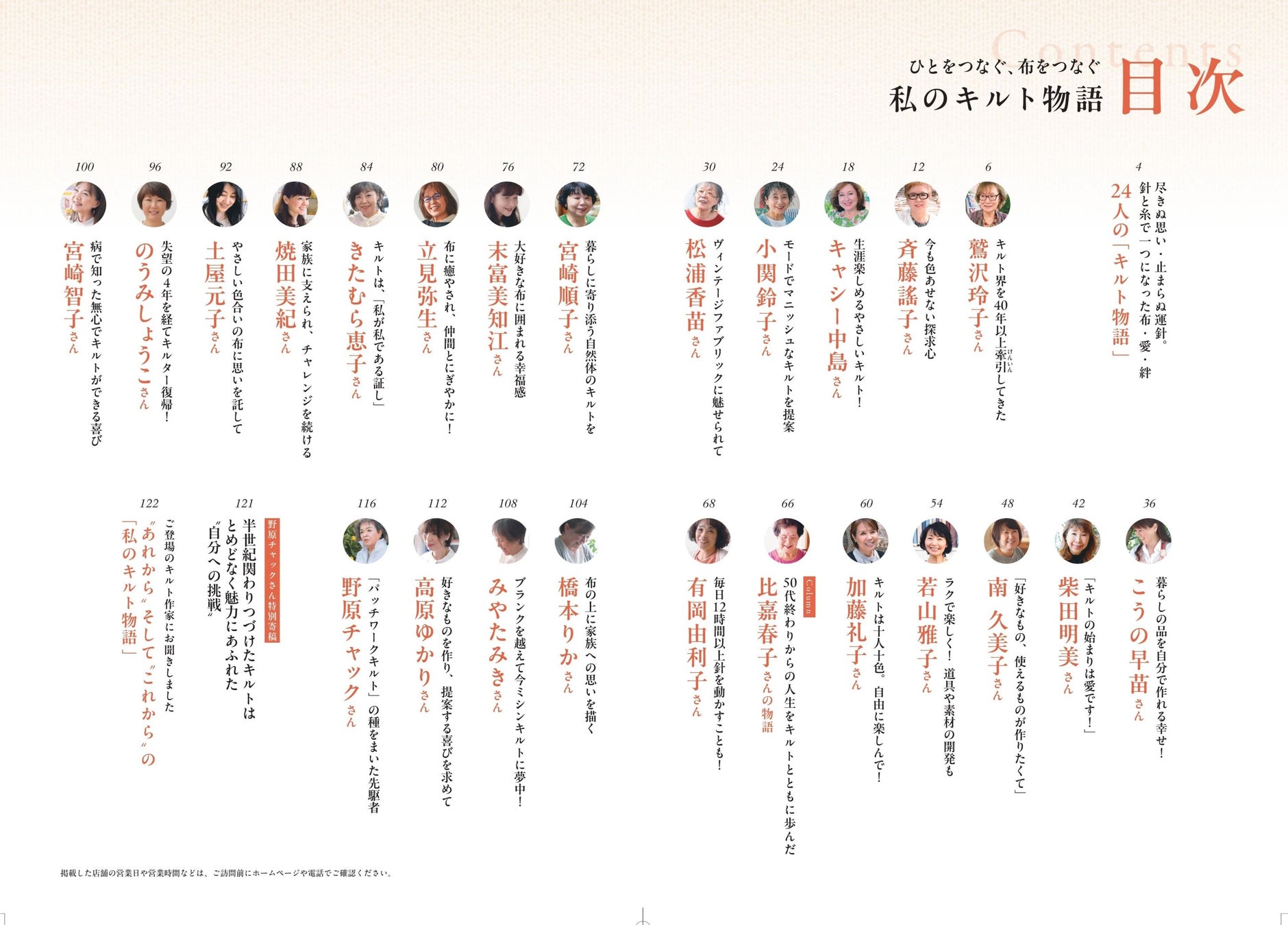 インテリア&ライフスタイル誌『私のカントリー』で最長の9年間続いた人気連載をまとめた待望の1冊! 24人のキルト作家さんによる美しいキルト作品と、それぞれの人生のストーリーを綴りました。オリジナリティあふれるキルトの数々は、創作の奥深い魅力を伝えてくれるでしょう。