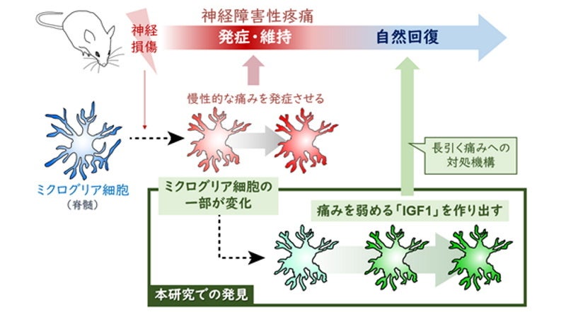 - 神経が傷つくと、非常に長引く痛み(神経障害性疼痛)を発症する。マウスでも神経損傷後に慢性疼痛を発症するが徐々に痛みが和らいでいく。しかしその自然回復のメカニズムは不明だった。