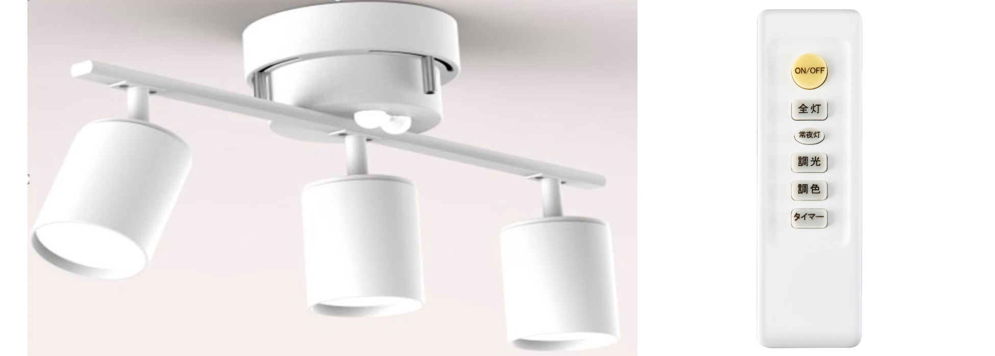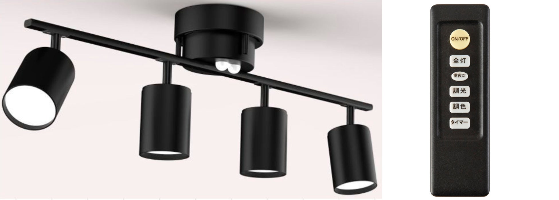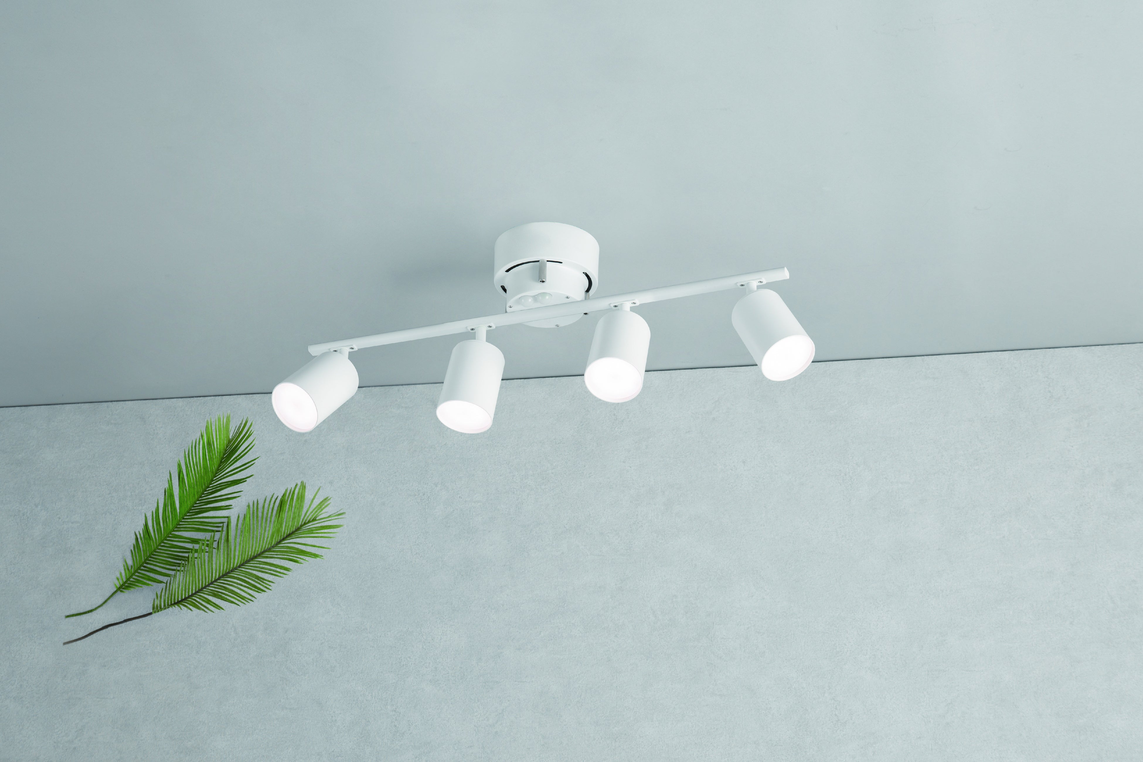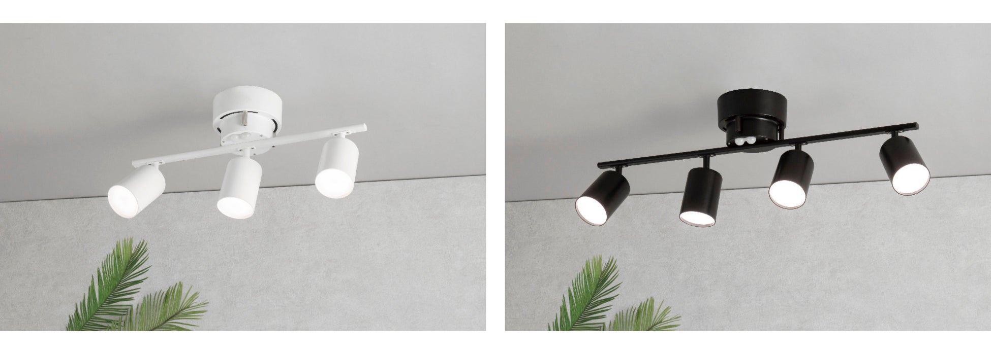 3灯・4灯の2種類をご用意し、おうちの天井に引掛シーリング・引掛埋込ローゼットがあれば簡単に取り付けができます。(※1)シェード部分は独立して角度を変えられることに加え、付属のリモコンで調光・調色が可能なので、空間演出のバリエーションが広がります。
