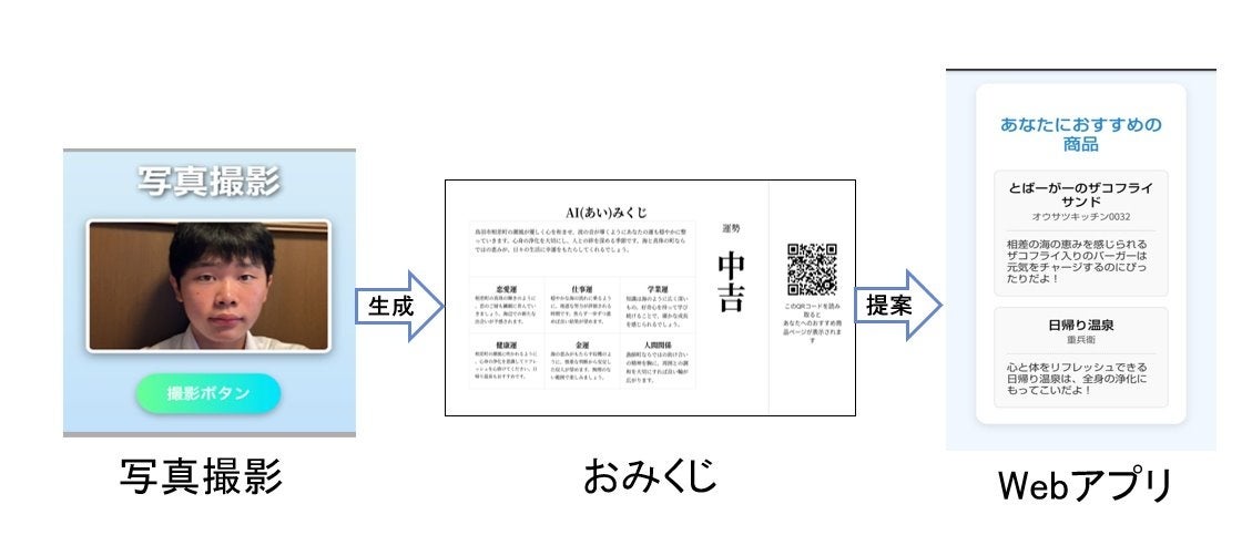 今回選出されたビジネスプランは、鳥羽市相差町の観光活性化を目的に開発したアプリケーション(以下、アプリ)を活用する「AI(あい)みくじで開運ショッピング」です。相差町では観光客数が増加する一方、1人当たりの消費額の減少が課題となっており、本アプリはその解決を目指して考案されました。スマートフォンで撮影した顔写真をもとに、AIが年齢層・性別・表情などを分析し、おみくじの結果としておすすめの地元特産品を提案する仕組みで、観光客一人ひとりに合わせた購買体験を提供します。表情や季節に応じて提案内容が変化する点も特徴で、リピーターにも新たな体験を提供できるサービスとして高く評価されました。