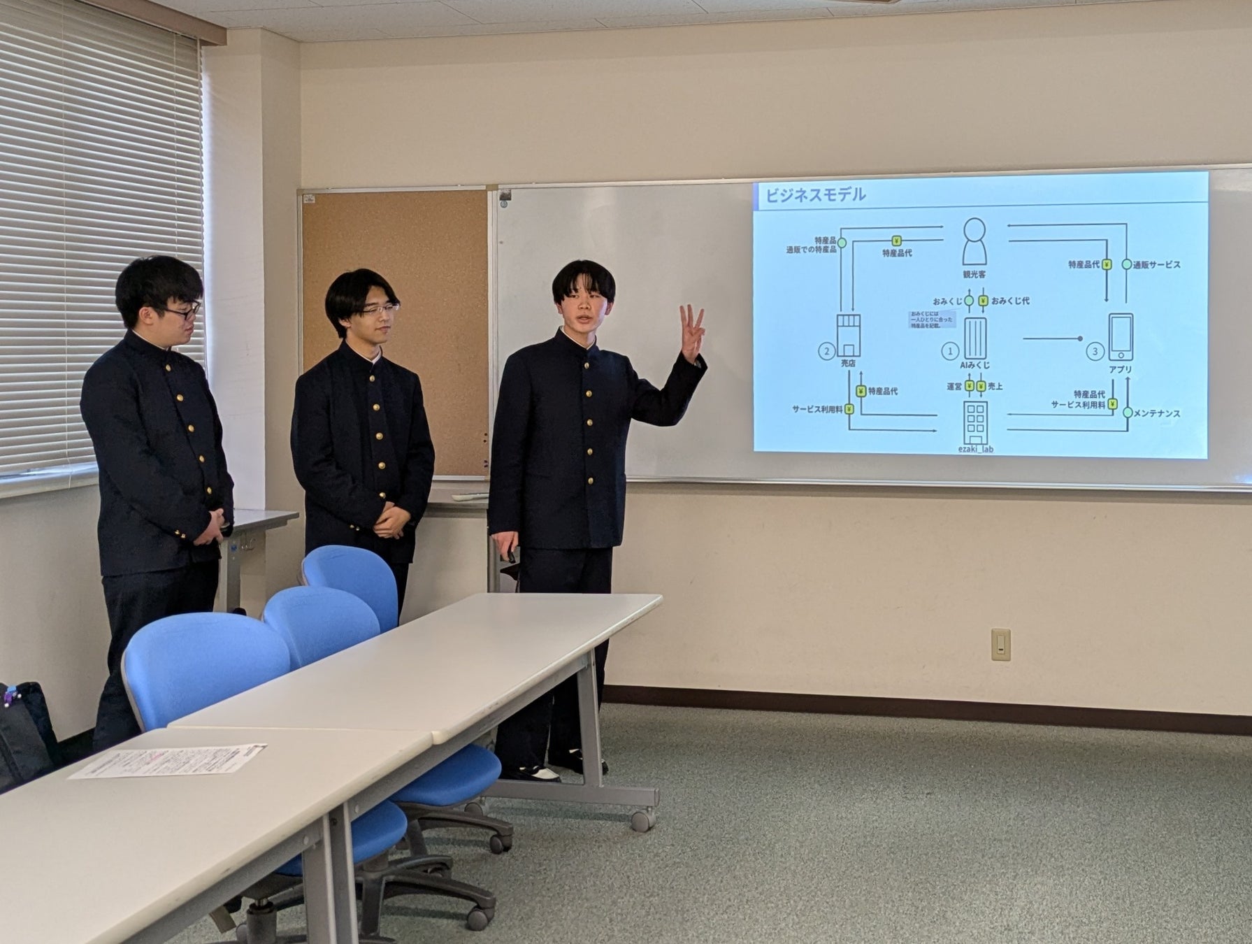 表彰式当日は、日本政策金融公庫 岡田伊勢支店長、得能課長代理、古山校長、指導教員の江崎教授を前に、学生がビジネスプランを発表しました。質疑応答では、同一人物が複数回利用した場合の仕組みについて質問があり、学生からは「表情や季節も分析要素に含まれるため、同じ人でも異なる結果が得られる」と説明がありました。
