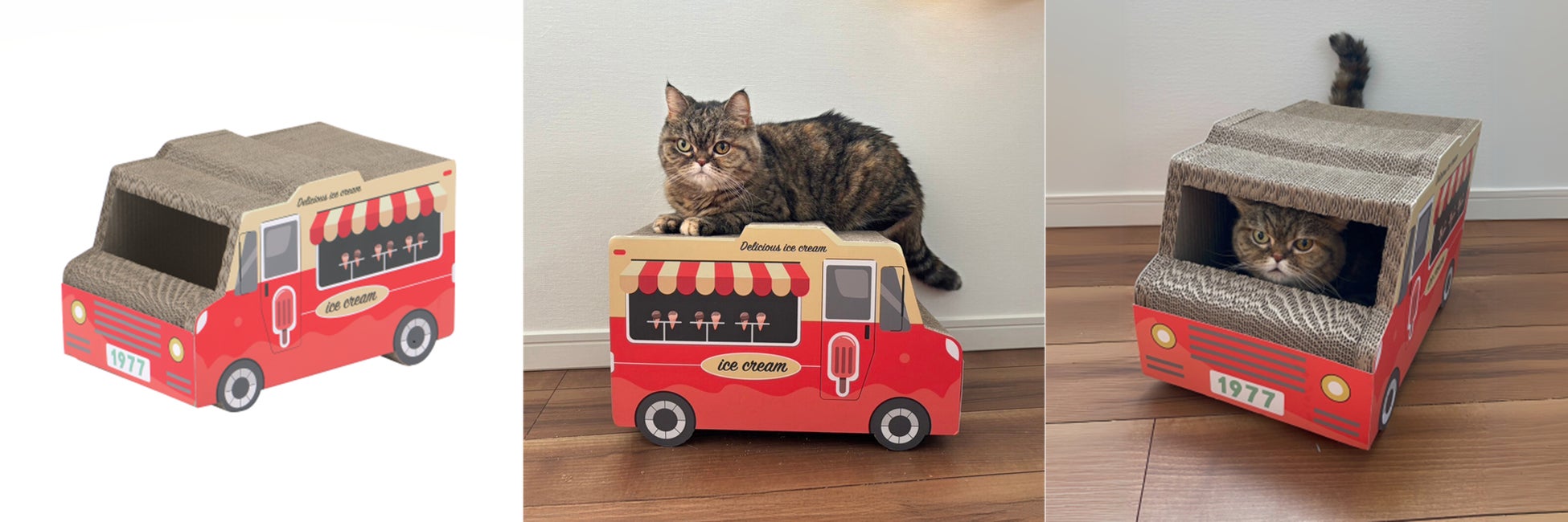 アイスクリームワゴンがモチーフの爪とぎです。猫ちゃんが運転席から顔をだしたら、シャッターチャンス!