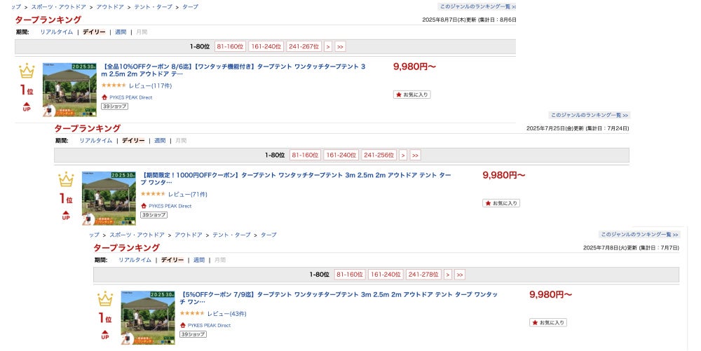 Fun Standard株式会社(本社:福岡県大野城市/株式会社RKB毎日ホールディングス グループ/代表取締役:大屋 良介、笹森 広貴)が展開するアウトドアブランド「PYKES PEAK(パイクスピーク)」の人気商品『ワンタッチタープテント』が、楽天市場アウトドア・日よけ用品カテゴリランキングで1位を獲得しました。
