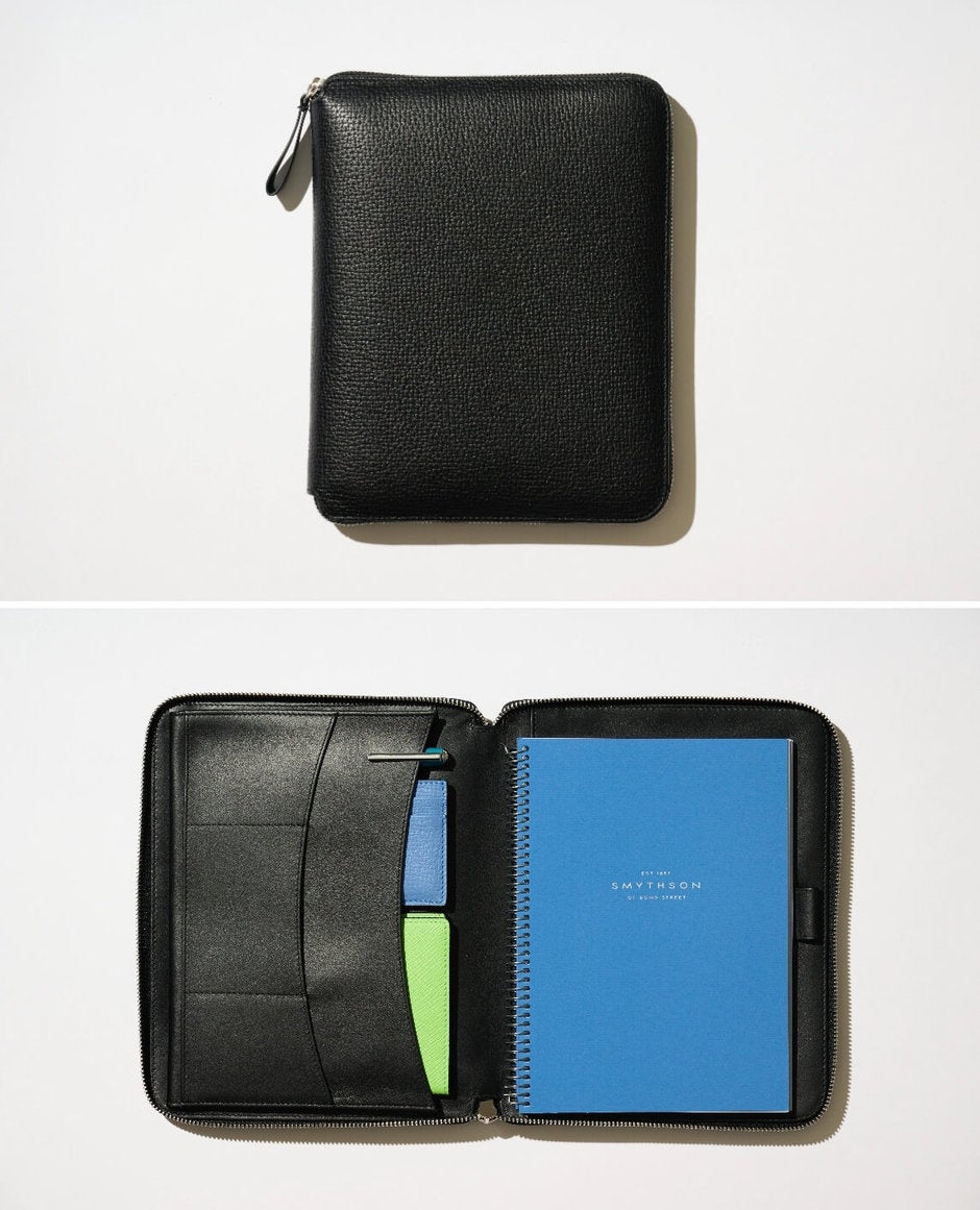 普段から仕事でノートを使う方にはスマイソンのジップホルダーがおすすめです。右側にはA5サイズのノートがセットされており、左側にはカードケースやペンなどを収納できる区分けされたポケットが付いています。