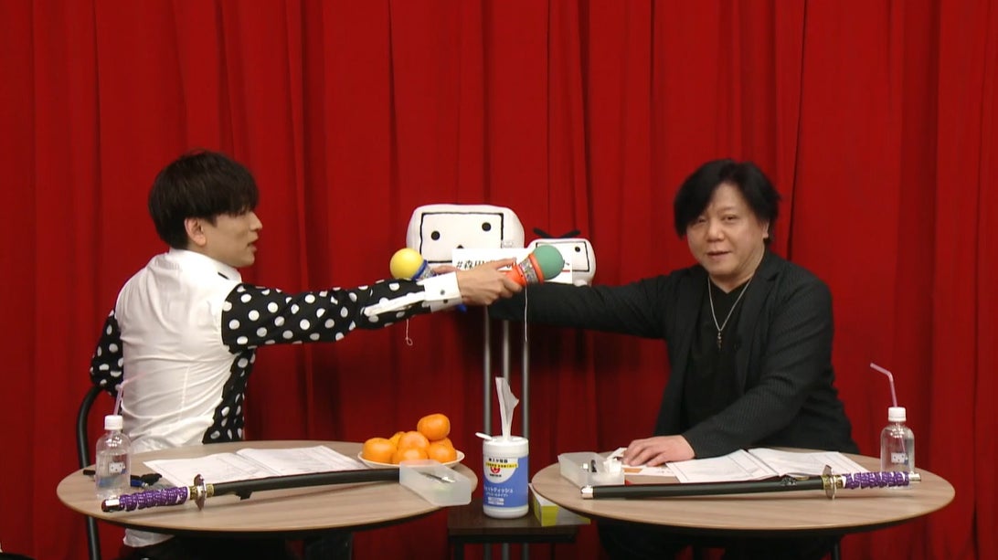 後半のanimelo+会員有料パートでは、「新春特別企画!新年だからシリーズ!」でまずは、「新年だから蜜柑を剥こう!未完の大作?蜜柑の傑作!」というコーナーから。比較的簡単なヘビのみかんアートを作りながらフリートークしていきます。しばらく話した後「おじさんたちがみかんにカッターを向けながら愚痴を言っているという、なんだこの非常にシュールな番組はw w」(森田)「大丈夫ですか?w視聴者の皆さんのコメントが読めないw w」(杉山)という二人の心配に、スタッフが「人生で初めてみる光景」という視聴者コメントを読み上げると、二人声をそろえて「でしょーーね!!!w」とリアクションし、スタジオでは笑いが。