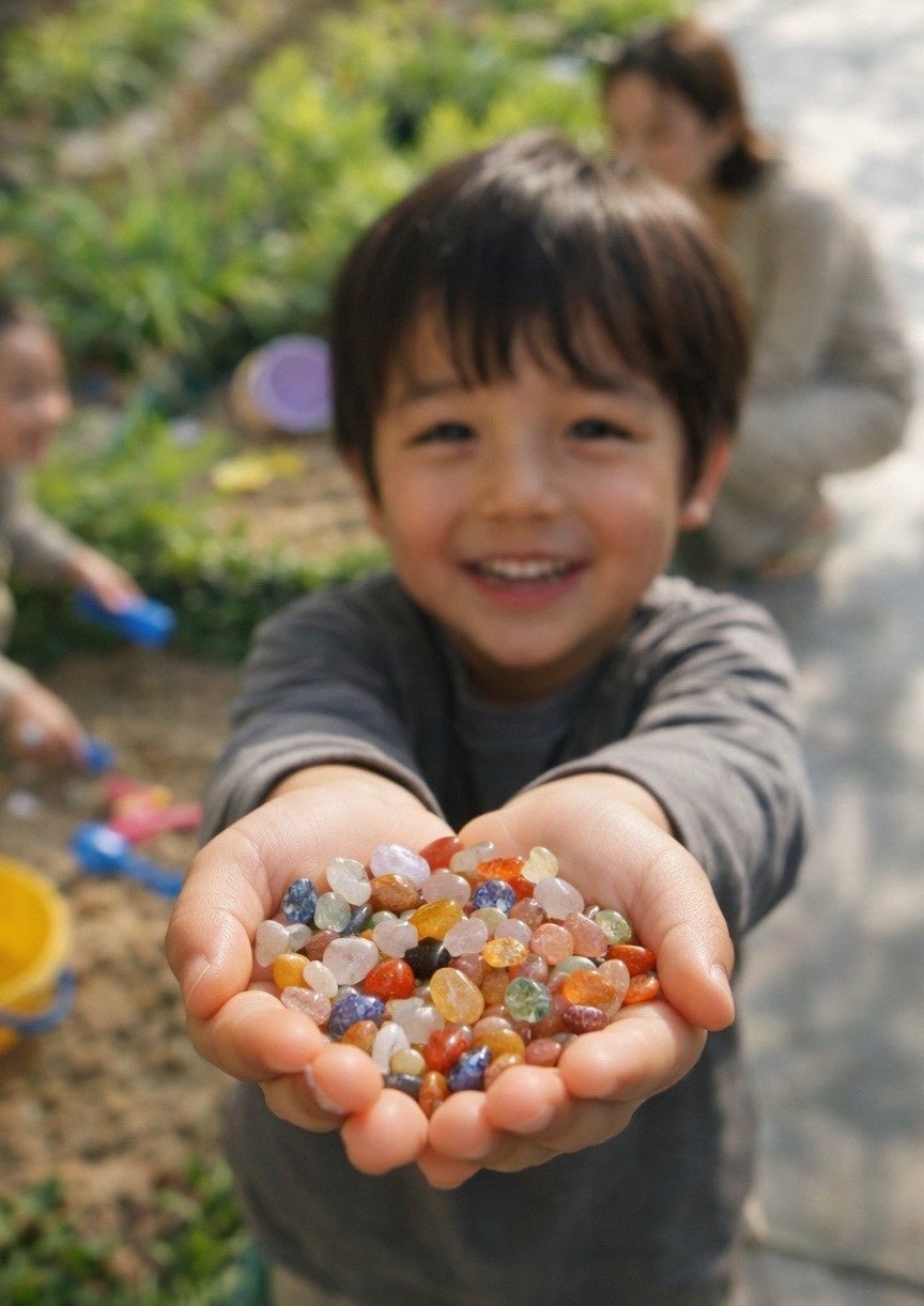 スコップですくうたびに、砂の中から キラリと光る天然石や水晶、カラーストーン が現れます。