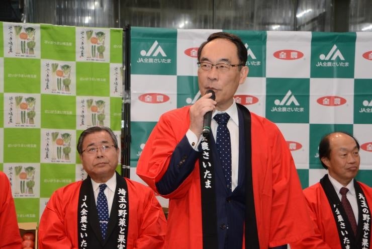 青果物の取扱が日本一の規模を誇り、また、埼玉県産野菜の最大の取引先である大田市場において、埼玉県知事、全農埼玉県本部運営委員会会長が、売買参加者に向けて、直接、埼玉県産春野菜のPR活動を行いました。