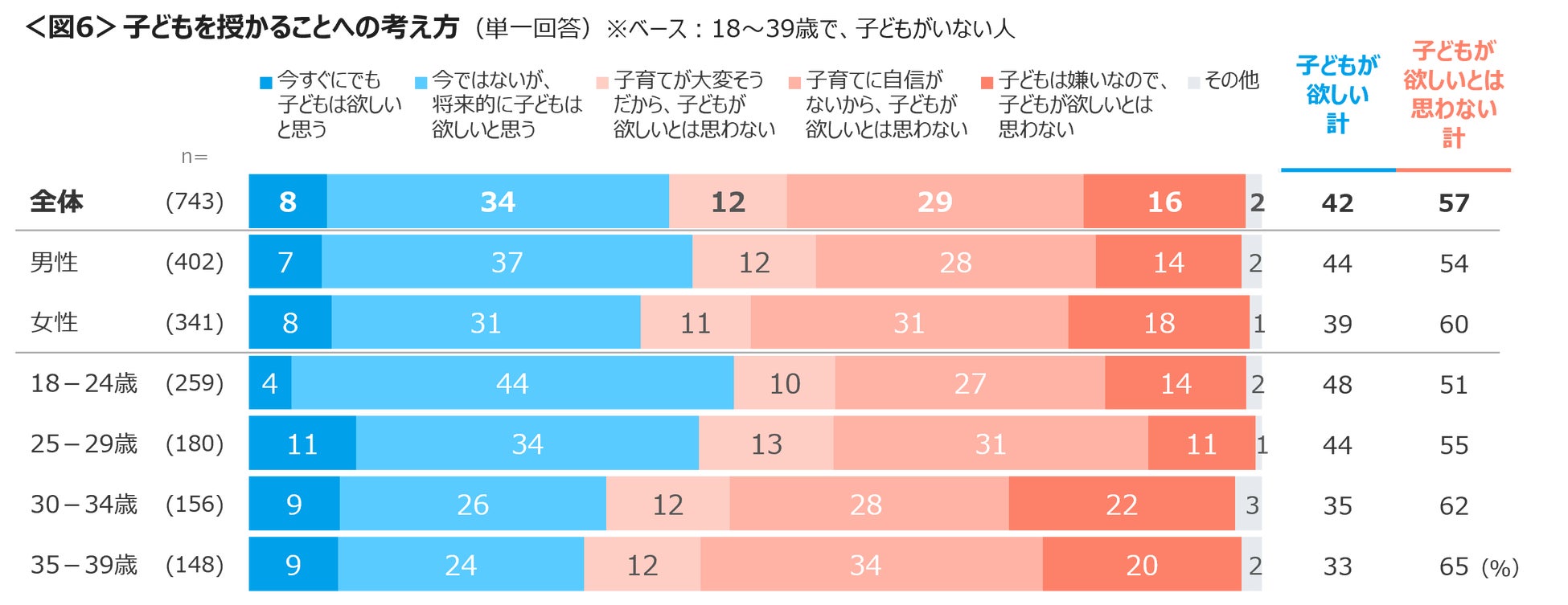 子どもを授かることについては、性別や年代別に見ても「子どもが欲しい」よりも「子どもが欲しいとは思わない」の方が上回る。「子どもが欲しい」は、18~24歳で48%、25~29歳で44%、30代は30%台にとどまった。<図6>