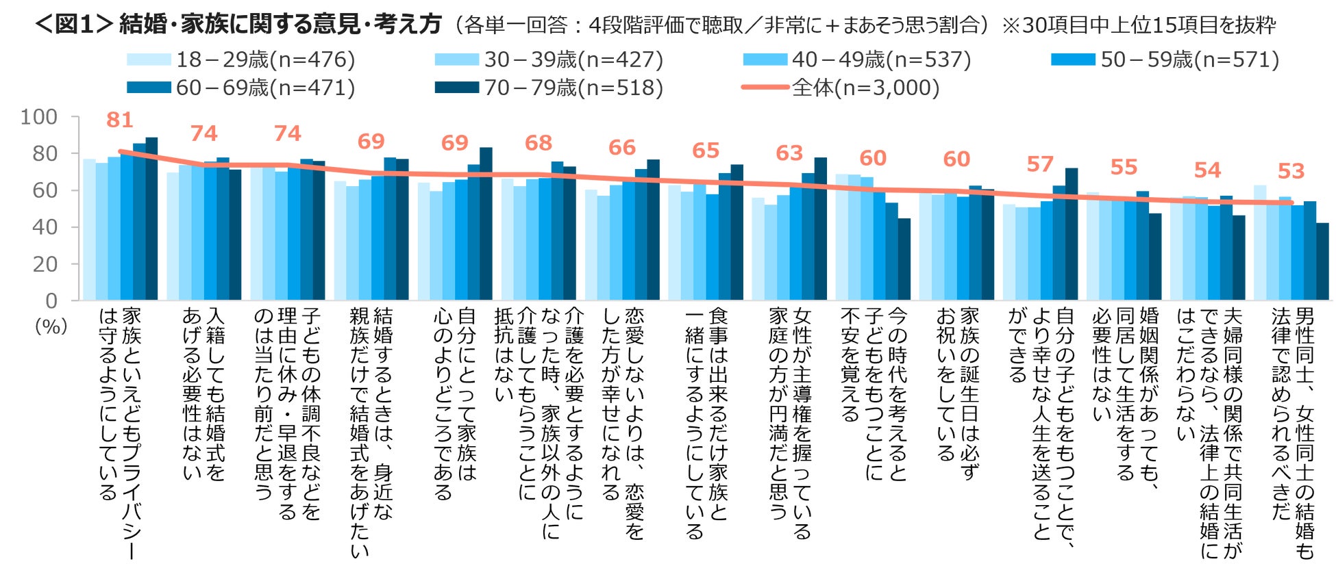 結婚・家族観についての意見・考え方を4段階で聴取した。非常に+まあそう思う割合は、「家族といえどもプライバシーは守る」81%、「入籍しても結婚式をあげる必要性はない」「子どもの体調不良などを理由に休み・早退をするのは当たり前」74%、「結婚するときは、身近な親族だけで結婚式をあげたい」「自分にとって家族は心のよりどころ」69%、「介護を必要とするようになった時、家族以外の人に介護してもらうことに抵抗はない」が上位にあがる。「今の時代を考えると子どもをもつことに不安を覚える」「男性同士、女性同士の結婚も法律で認められるべきだ」は、若い年代ほど割合が高まる。<図1>