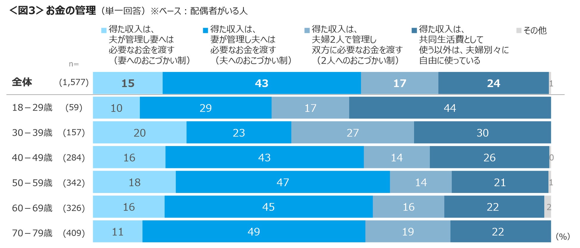 お金の管理は「妻が管理し夫へのおこづかい制」が43%、「共同生活費以外は、夫婦別々に自由に使う」は24%である。 「妻が管理し夫へのおこづかい制」 は40代を境に年代が上がるにつれ割合が増える。「共同生活費以外は、夫婦別々に自由に使う」 は、18~29歳は44%、30代は30%とTOPにあがった。<図3>