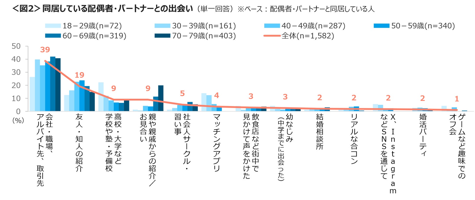 同居している配偶者・パートナーとの出会いは、「会社・職場、アルバイト先、取引先」39%、「友人・知人の紹介」19%がTOP2。70代では「親や親戚からの紹介/お見合い」が2番手の20%。18~29歳、30代の「マッチングアプリ」は10%台で3番手にあがった。<図2>