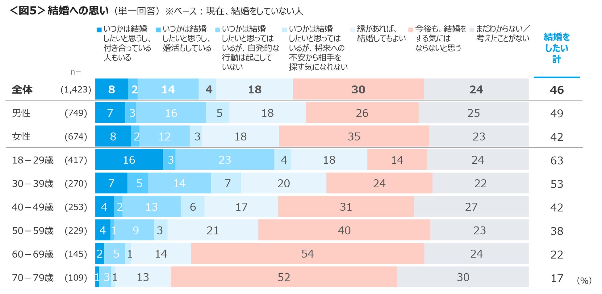 現在配偶者のいない人に対し結婚の意思を確認した。「結婚をしたい」人は46%、「今後も、結婚をする気にはならない」は30%、男女間で大きな差は見られなかった。18~29歳は「いつかは結婚したいが、自発的な行動は起こしていない」が23%と高い。「結婚をしたい」意識は、18~29歳で63%、30代は53%、それより上の年代は半数に満たない。 <図5>