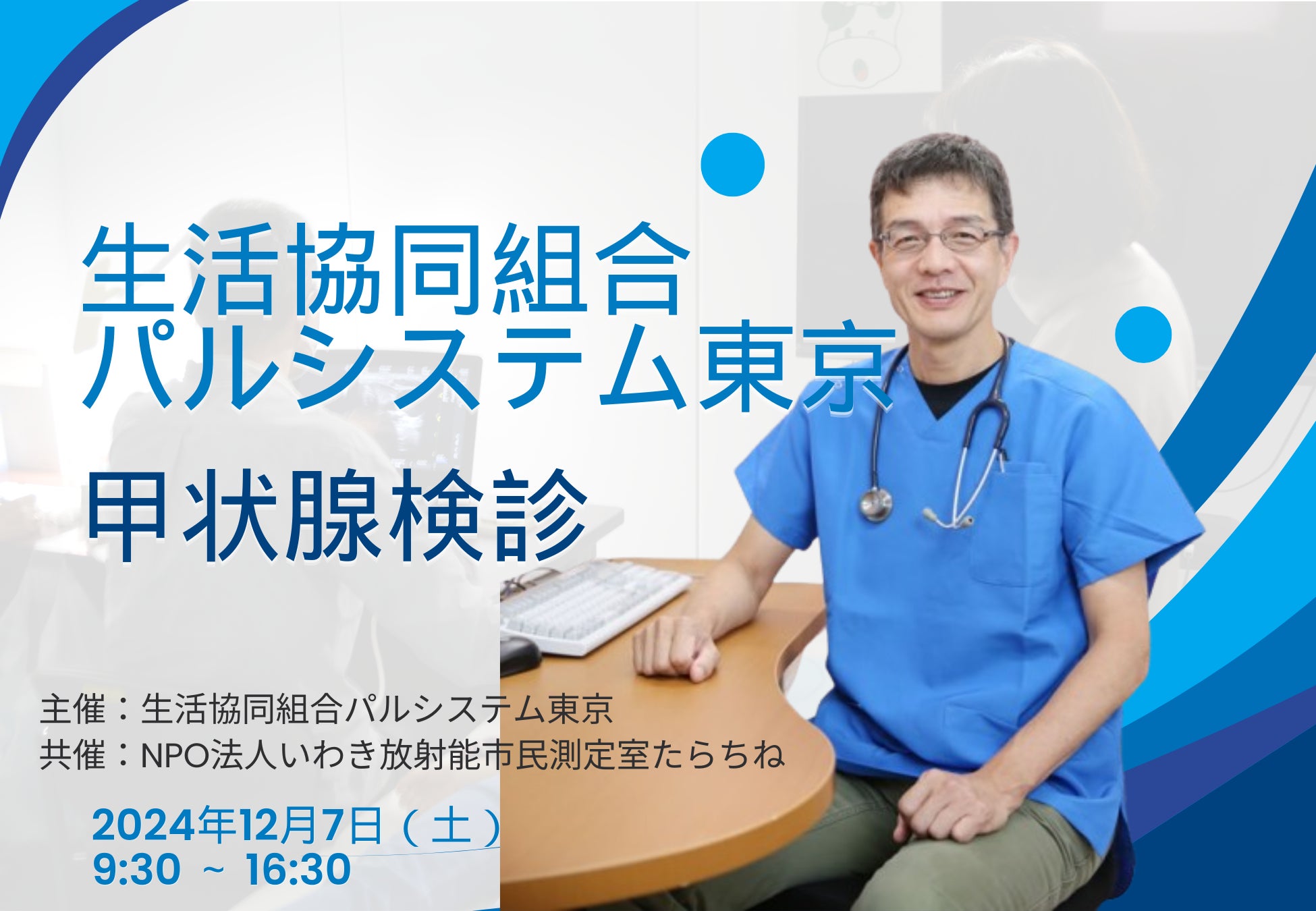 甲状腺検診は、福島の原発事故を機に設立された認定NPO法人いわき放射能市民測定室たらちね(本部:いわき市小名浜、鈴木薫理事長)の協力で、甲状腺エコー検査を実施します。対象は、3歳から事故発生当時18歳だった31歳までのパルシステム東京利用者とその家族、および東日本大震災の広域避難者です。事前申し込みを受け付け、最大70人の参加を予定します。