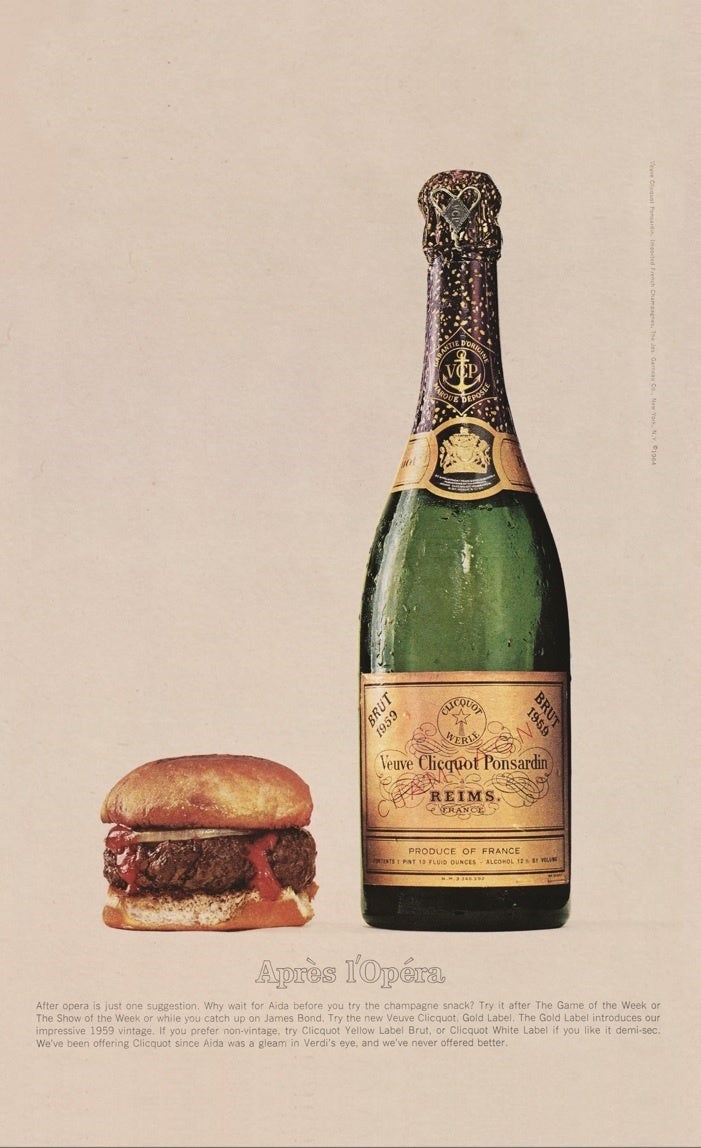 1964年に雑誌「ザ・ニューヨーカー」に掲載された、「ヴーヴ・クリコ イエローラベル」とハンバーガーのアイコニックな広告ポスター「オペラの後」。そのユニークなペアリングとヴィジュアルが話題を呼ぶとともに、大胆さと革新的な感性を持つヴーヴ・クリコは、シャンパーニュとの自由なフードペアリングを世に広めました。