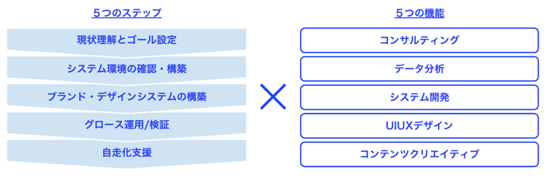 オウンド・UX・サービスの構想〜開発〜グロースに知見と経験を持ち、現状理解とゴール設定を中心に、5つのステップ全体を推進するチーム。