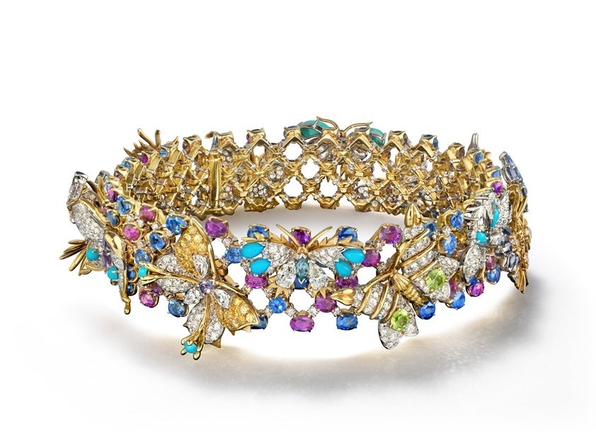 またジャン・シュランバージェがティファニーのために手掛けた初期のハイジュエリーデザインの一つである「バタフライ チョーカー」は、ヘリテージ賞を受賞しました。1956年にデザインされたこの作品は、友人でアメリカの慈善家兼園芸家であるレイチェル・ランバート〝バニー〟メロンから着想を得て製作された、蝶の美しさを捉えたネックレスです。これは、彼女が五番街のティファニー本店に当時新設されたシュランバージェ サロンを訪れた際に生まれたアイデアで、同年、ティファニーの職人たちがニューヨークのハイジュエリー工房で具現化しました。ダイヤモンド、ターコイズ、アメジスト、ペリドット、サファイヤ、スピネルを精緻に配し、蝶が羽ばたく躍動感を想起させます。バージニア美術館より貸与されたこの作品は、ジャン・シュランバージェのハイジュエリー作品、そしてメロンとの深い交流を象徴する傑作として今なお高く評価されています。