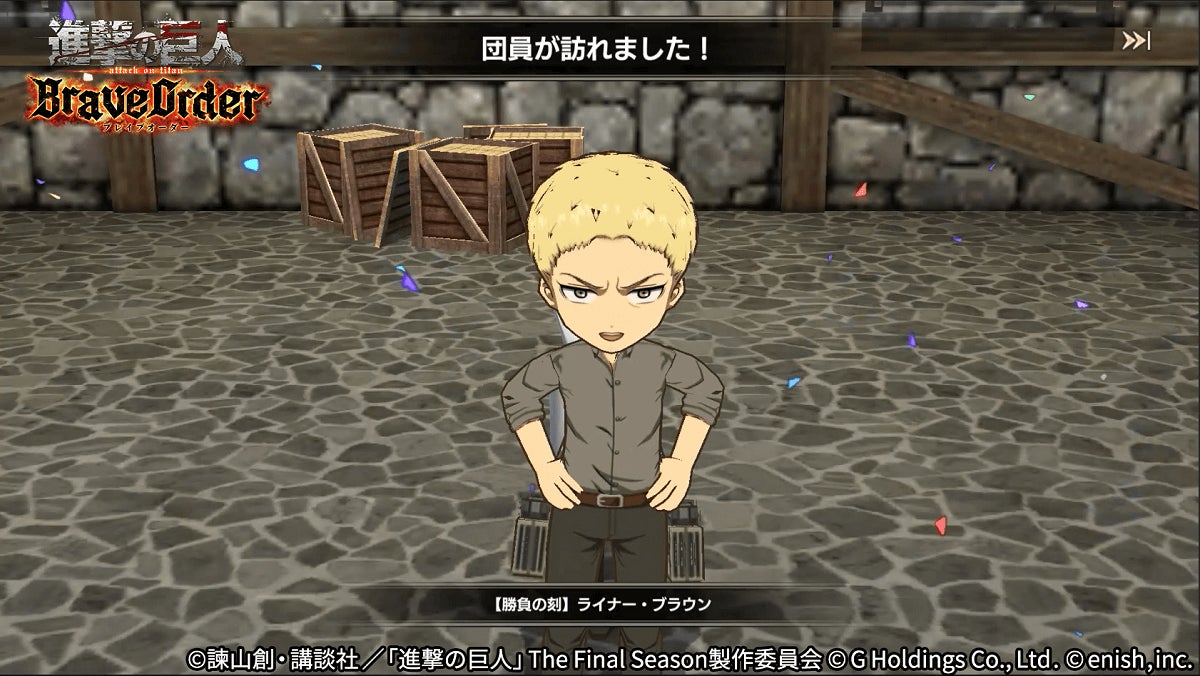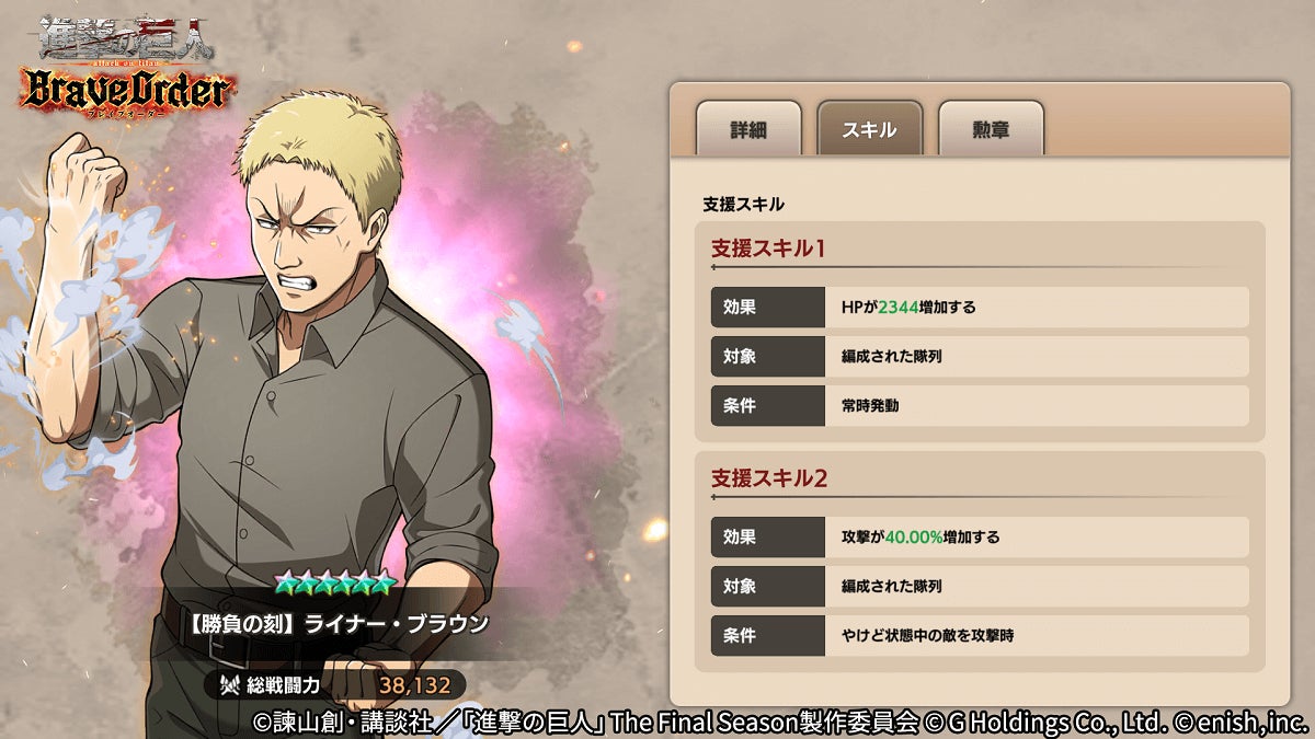 株式会社enish(本社:東京都港区、代表取締役社長:安徳 孝平、以下enish)は、アニメ『進撃の巨人』のスマートフォンゲーム最新作「進撃の巨人Brave Order」にて、新イベント「二大巨人との戦い ~打・投・極~」を開催!イベントアイテムの「鎧の巨人の欠片」を集めて豪華報酬をGETしよう!また、本日より新登場の【座標の力】エレン・イェーガー、【勝負の刻】ライナー・ブラウン、【勝負の刻】ベルトルト・フーバーがピックアップされた「二大巨人との戦い ~打・投・極~ガチャ」も同時開催!その他、最新情報はゲーム公式サイト・ゲーム公式Twitterアカウントにて随時公開して行きますので、ぜひご覧ください。