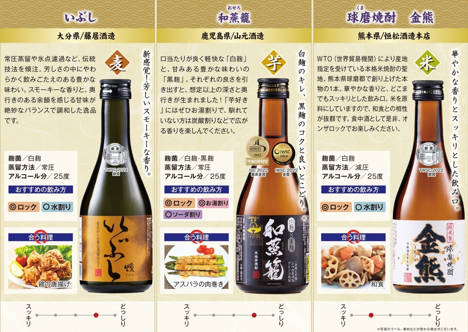 「九州3酒蔵 焼酎ギフト 酒器&おつまみセット」は、鹿児島県の山元酒造、大分県の藤居酒造、熊本県の恒松酒造本店の3つの酒蔵から、こだわりの焼酎を取り揃えました。品評会にて受賞した芋・麦・米それぞれの焼酎をご堪能いただける、特別なセットです。