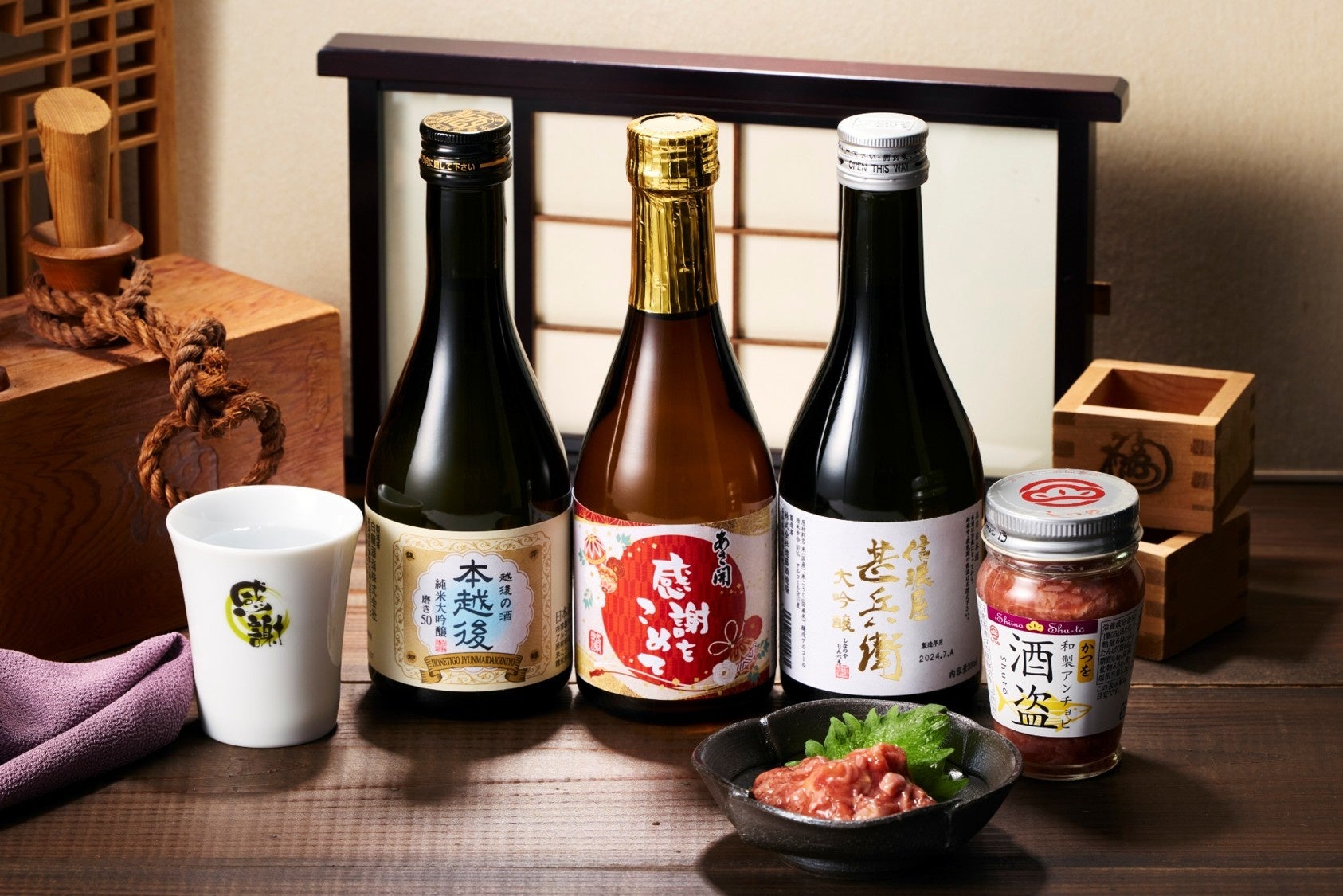 どちらのセットにも、お酒の味わいや各蔵の説明が解説された説明書が付いており、飲みくらべがお楽しみいただけます。さらに、お酒にぴったりの酒器と酒盗もセットになっており、メッセージ付きの化粧箱でお届けします。