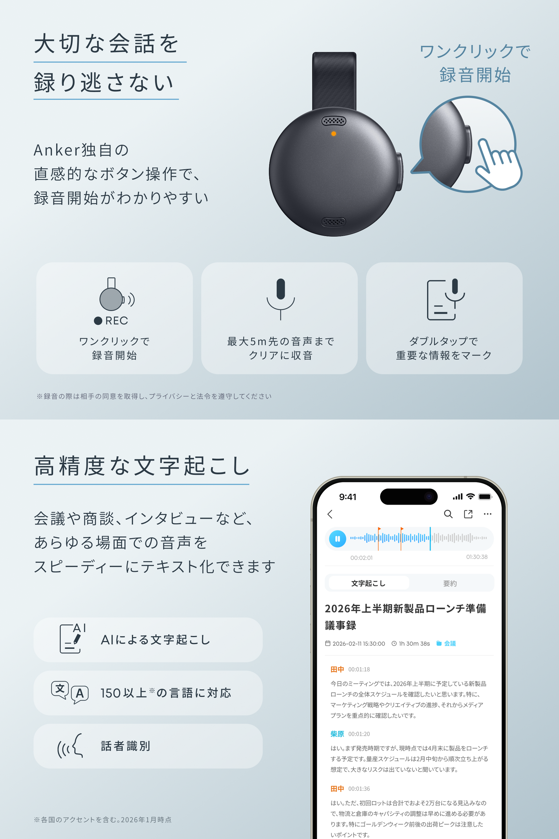 - Anker初のAIボイスレコーダー:会議や商談、インタビューなどの音声をワンクリックで録音し、AIにより自動で文字起こしから要約までを行うことができるAnker初のウェアラブルAIボイスレコーダーです。