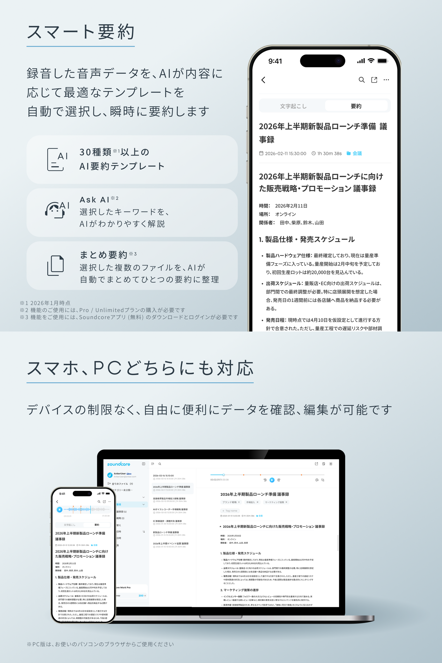- 録音時間は使用環境によって異なります - データ転送時間は環境により異なります - AIによる文字起こしや要約機能を使用する際は、Soundcoreアプリのインストールとログインが必要です - 録音の際は相手の同意を取得し、プライバシーと法令を遵守してください - 機能のご使用には、Soundcoreアプリのインストールとログインが必要です、詳細は製品ページをご確認ください(https://www.ankerjapan.com/pages/soundcore-work) |