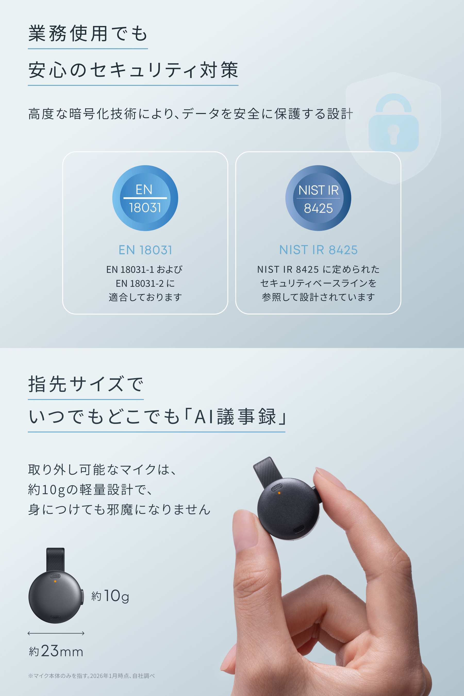 文字起こしや要約はスマートフォンだけでなくPCでも録音データの確認や編集が可能です。また、サブスクリプションのUnlimitedプランでは文字起こし時間を無制限に利用できる(※6)だけでなく、複数の録音データをまとめて要約する機能もご利用いただけます。さらに欧州のRED(無線機器指令)における法的要件を遵守するため、整合規格である「EN 18031」に基づいたセキュリティ設計を採用しています。また、米国の消費者向けIoTセキュリティ基準「NIST IR 8425」の第三者認証も取得し、業務でも安心してお使いいただけます。会議や商談、インタビューといったビジネスシーンはもちろん、介護や医療、建設や接客等の現場や、手が離せないシーンにも最適な、記録業務の効率化と生産性向上を実現する製品です。