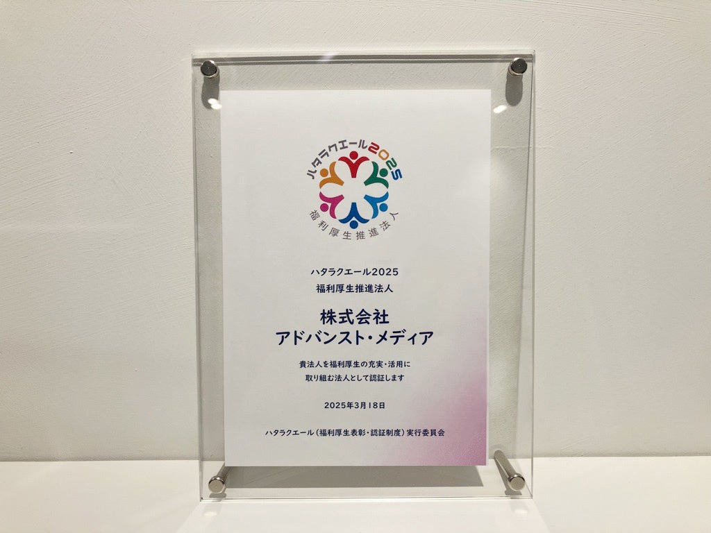 株式会社アドバンスト・メディア(以下、アドバンスト・メディア)がハタラクエール2025の「福利厚生推進法人」に認定され、表彰楯を授与されました。