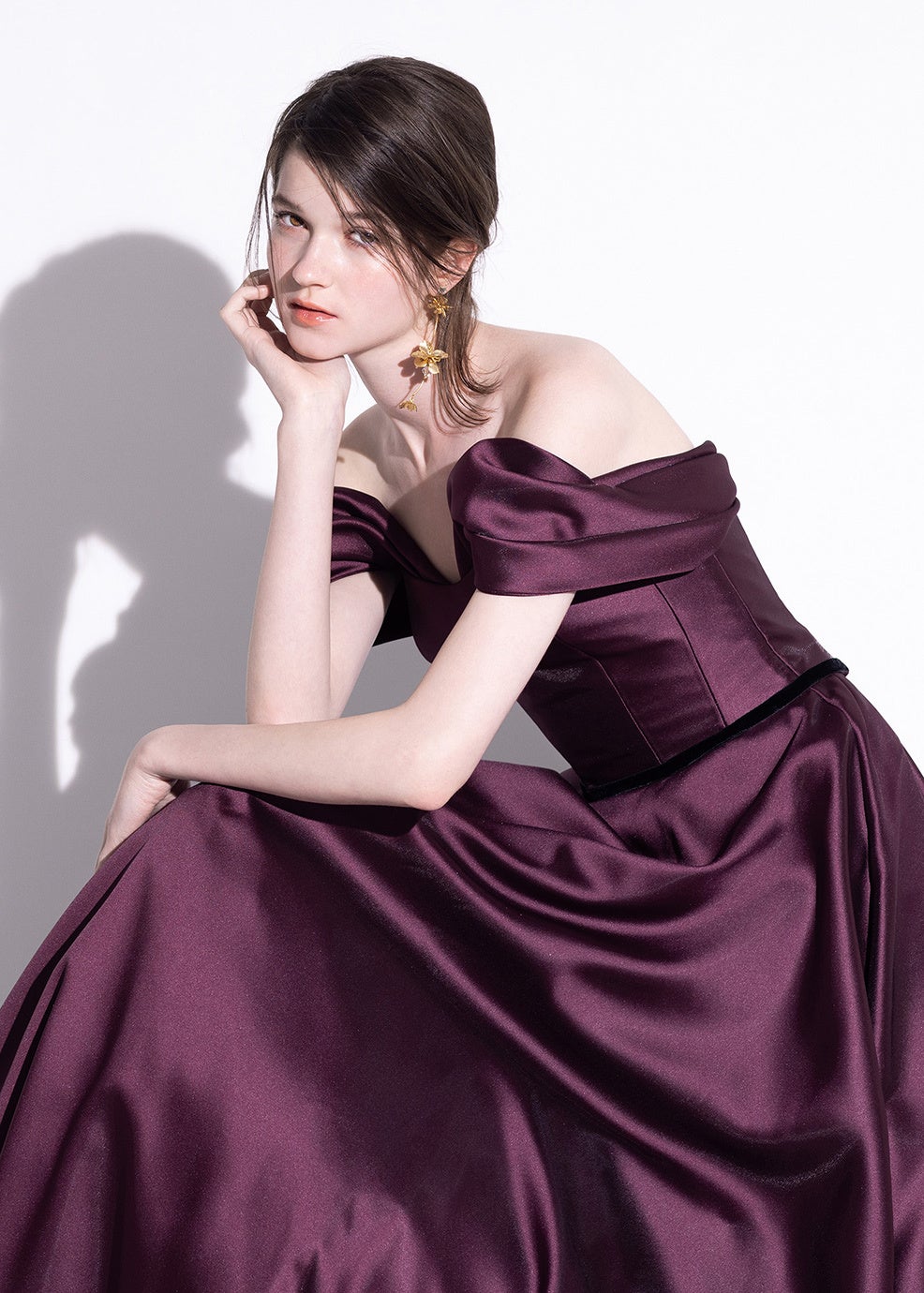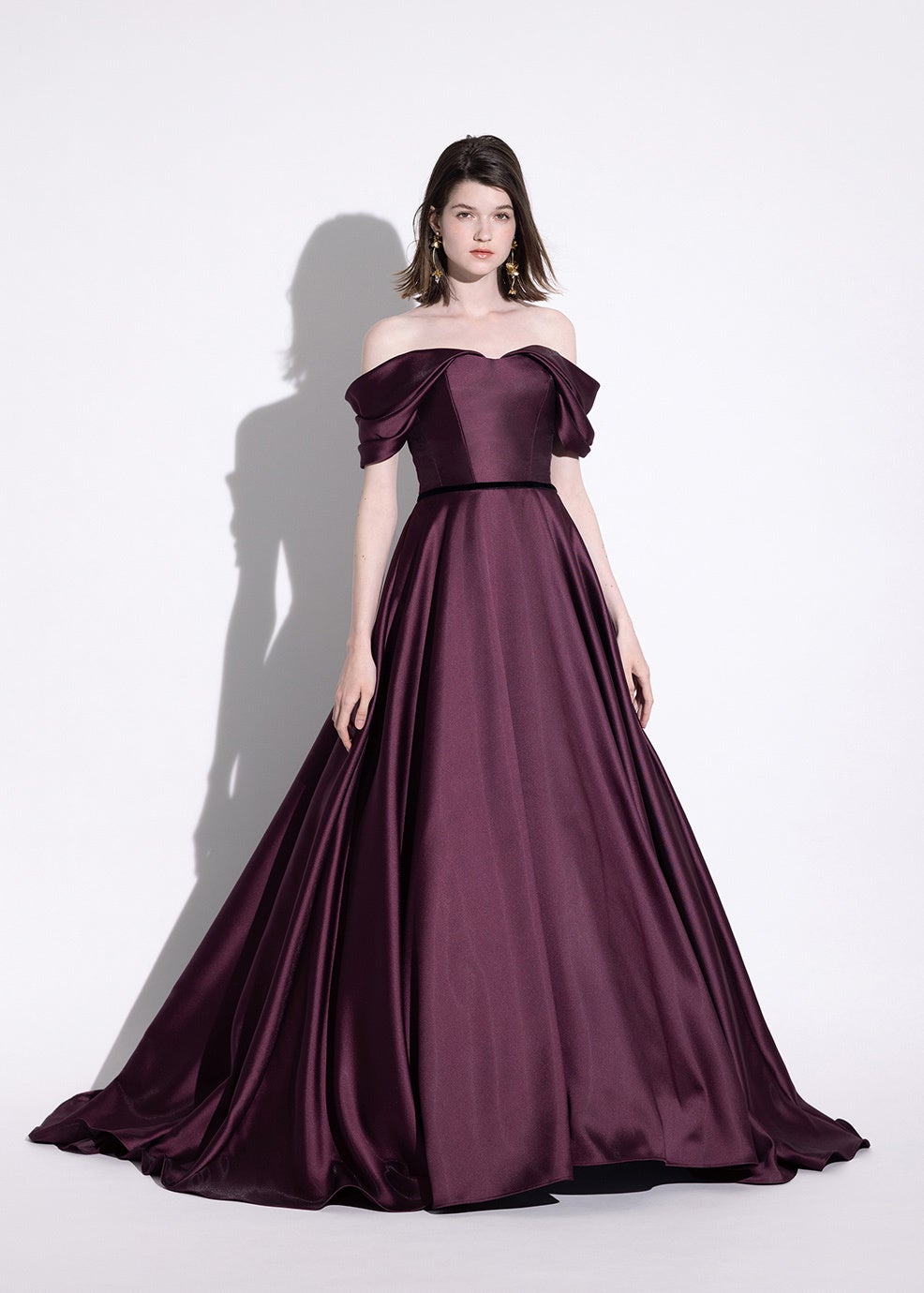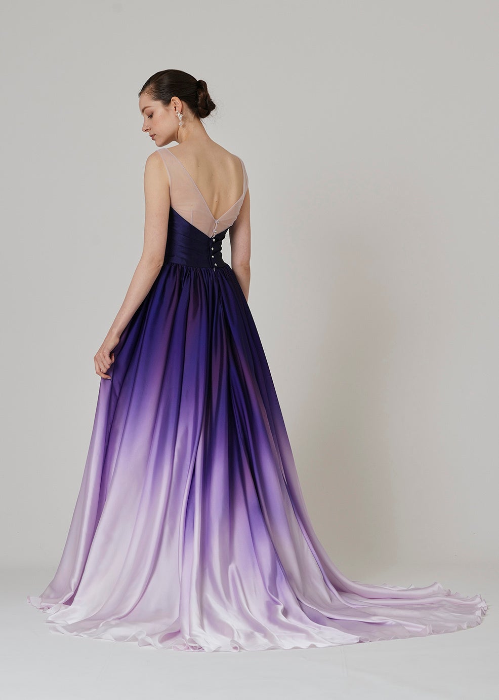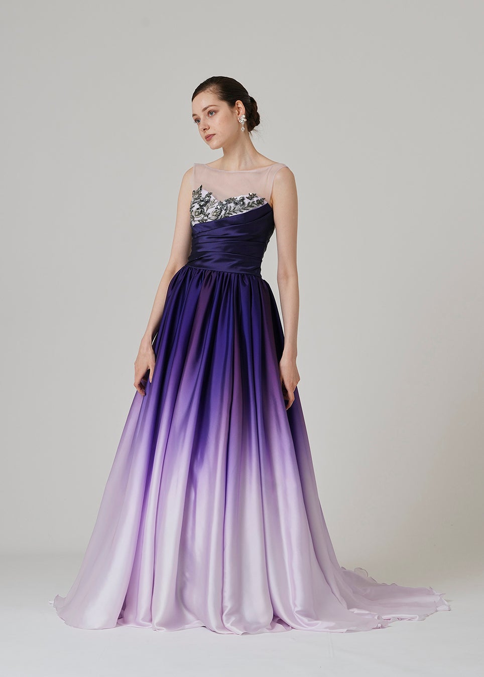 ヴィオラの花びらのようなパープルの濃淡のグラデーションをやわらかなプリントクレープサテンで表現した、パッと目を引くフォトジェニックな1着。胸元には立体的なインドビジューを配し、上品な輝きを添えます。 MATERIAL : グラデーションクレープサテン・サテン