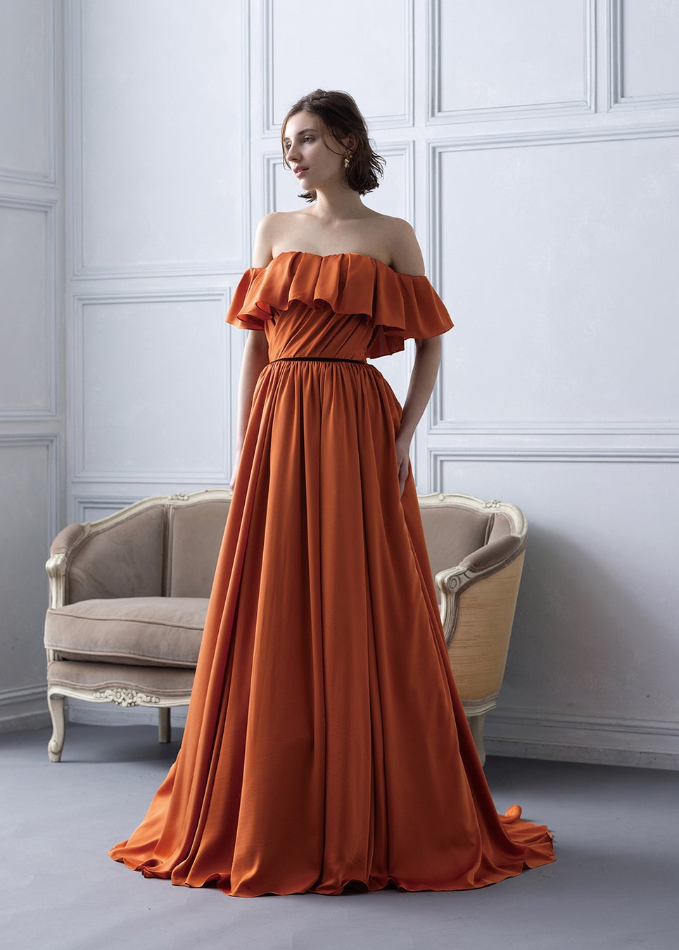 シルデューサテンのしっとりした生地感が女性らしいシルエットを作り出します。 スカートの脇ラインの丈を長くすることによりスタイルの良さ、ドレス全体の華やかさを表現しています。 身頃のタックもすっきり見せるようにアシメトリーにデザインしました。 胸元のフリルは取り外し式です。胸元の印象が変わるのでお好きないイメージで着て頂けます。 赤でもオレンジでもブラウンでもないテラコッタカラーは、色の奥行きがありワンランク上の花嫁を演出してくれます。