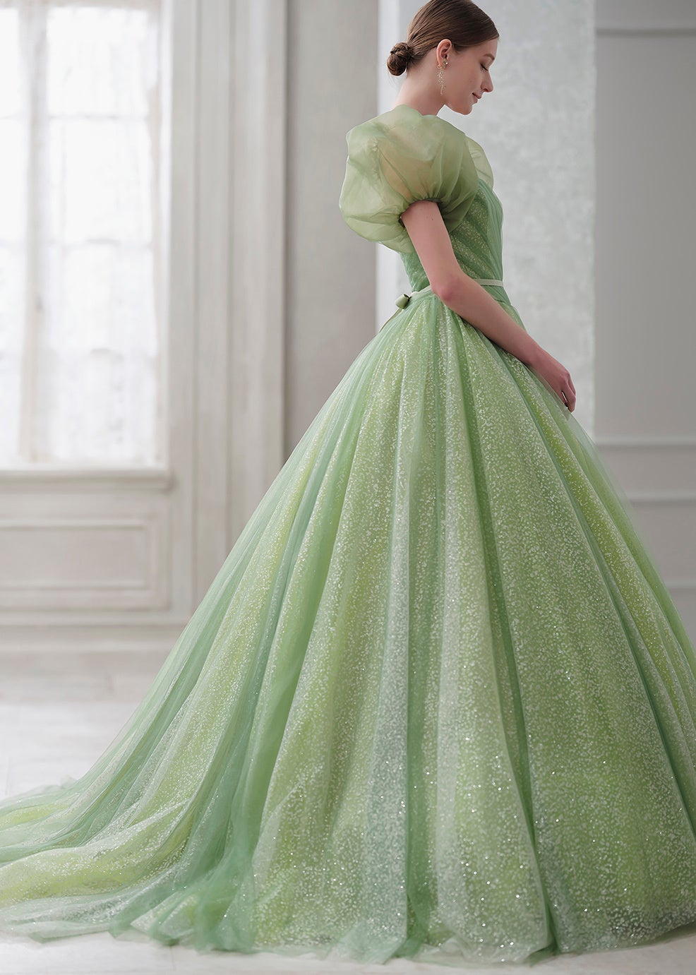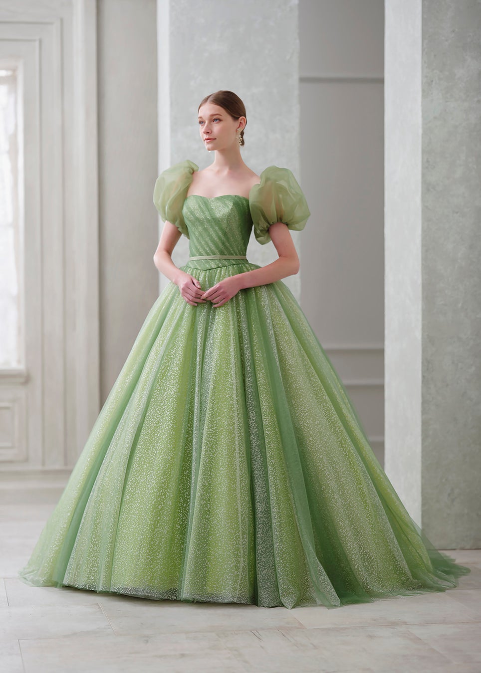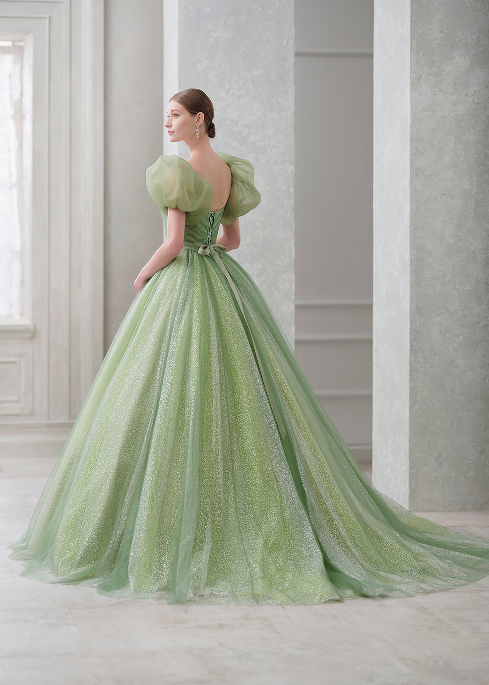 ビックラインのシルエットに全身グリッターを使用したプリンセス感あふれる1着。 シルエットときらめきの華やかさで見せるドレスです。 色は流行色でもある鮮やかなグリーン。 ドレス本体はシンプルなプリンセスラインですが、パフスリーブのお袖を付ると、1段とプリンセス感がアップします。 MATERIAL : チュールグリッター