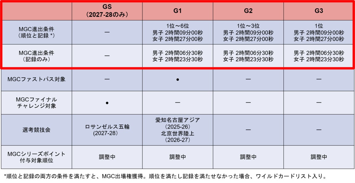 また、MGCシリーズの加盟大会において、順位とタイムをクリアすると「ロサンゼルス 2028オリンピック競技大会マラソン日本代表選手選考競技会」として 2027 年に開催するMGCへの出場権を得ることができます。