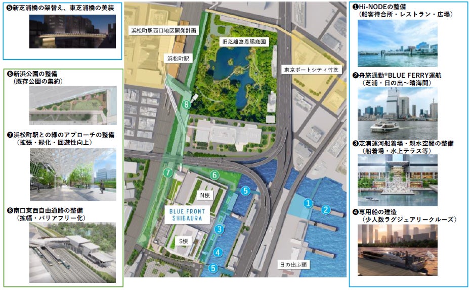 また、羽田空港から都心部への玄関口である「浜松町駅周辺エリア」は、今後複数の大規模開発が進むことで、観光客等の来街者及び就労人口の増加が見込まれる注目すべきエリアです。2025年春頃には本プロジェクトと、「浜松町駅との緑のアプローチ」が開通し、利便性が向上します。主要鉄道駅から水辺へのアクセスを改善することにより、ベイエリアと東京都心部をつなぐことを実践していきます。(下記、図2の❺~❽参照)