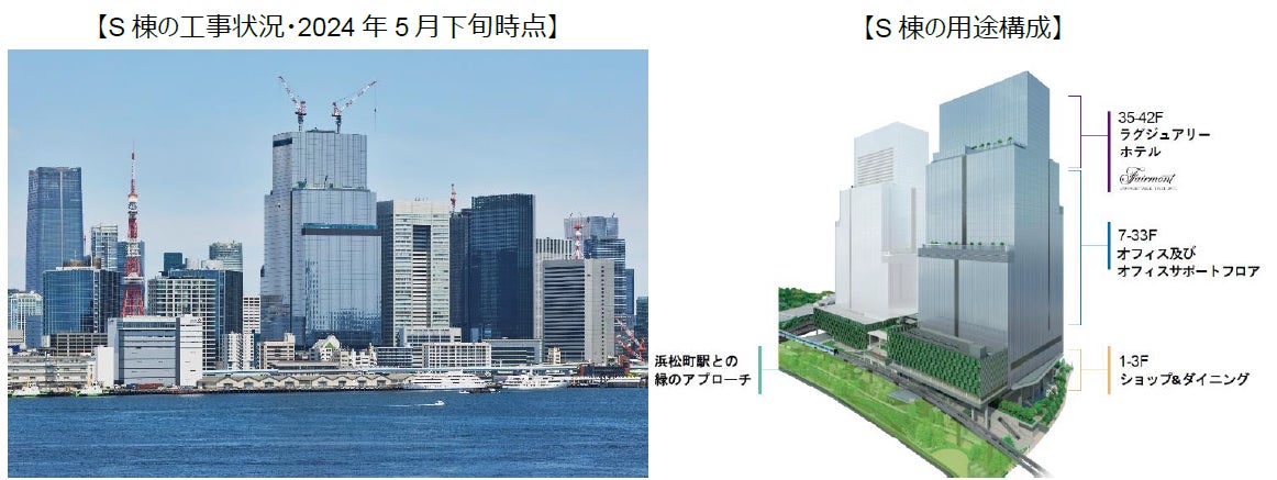 ツインタワーの1棟目であるS棟は、2024年3月に上棟を迎え、2025年2月の竣工に向けて工事を推進しております。S棟は主に「ラグジュアリーホテル」、「オフィス」、「商業施設」から構成されています。