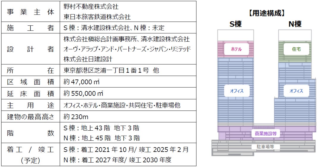 本プロジェクトは、浜松町ビルディング(東芝ビルディング:東京都港区芝浦1-1-1)の建替事業として、高さ約230mのツインタワーの建設を予定しています(S棟:2025年2月竣工予定、N棟:2030年度竣工予定)。区域面積約4.7ha、延床面積約55万㎡の、オフィス・ホテル・商業施設・住宅を含む、約10年間に及ぶ大規模複合開発です。