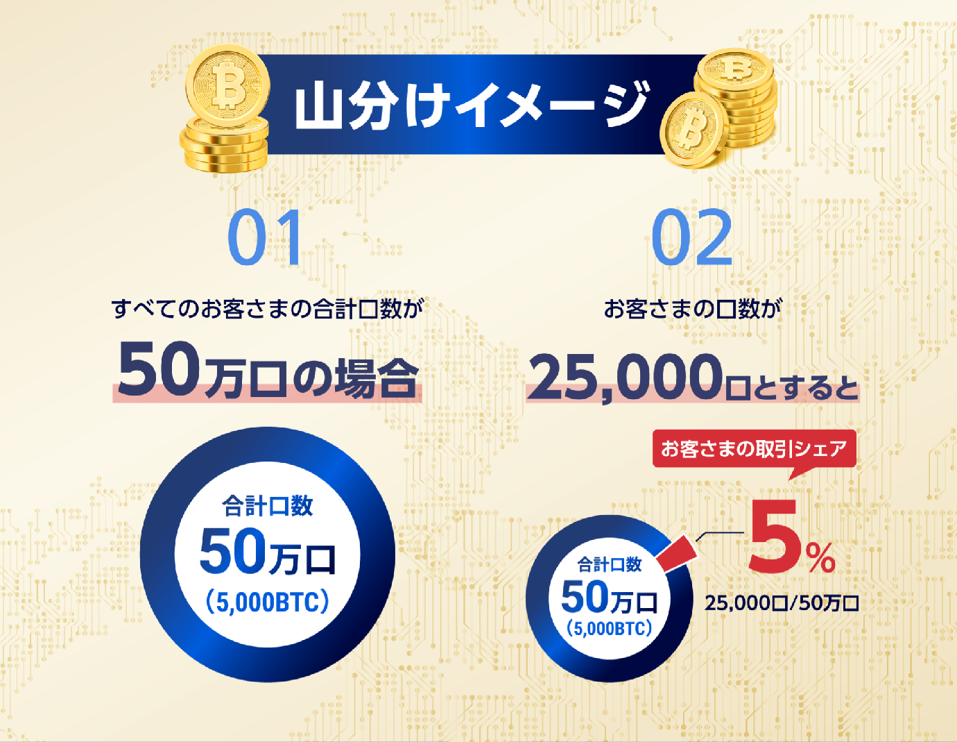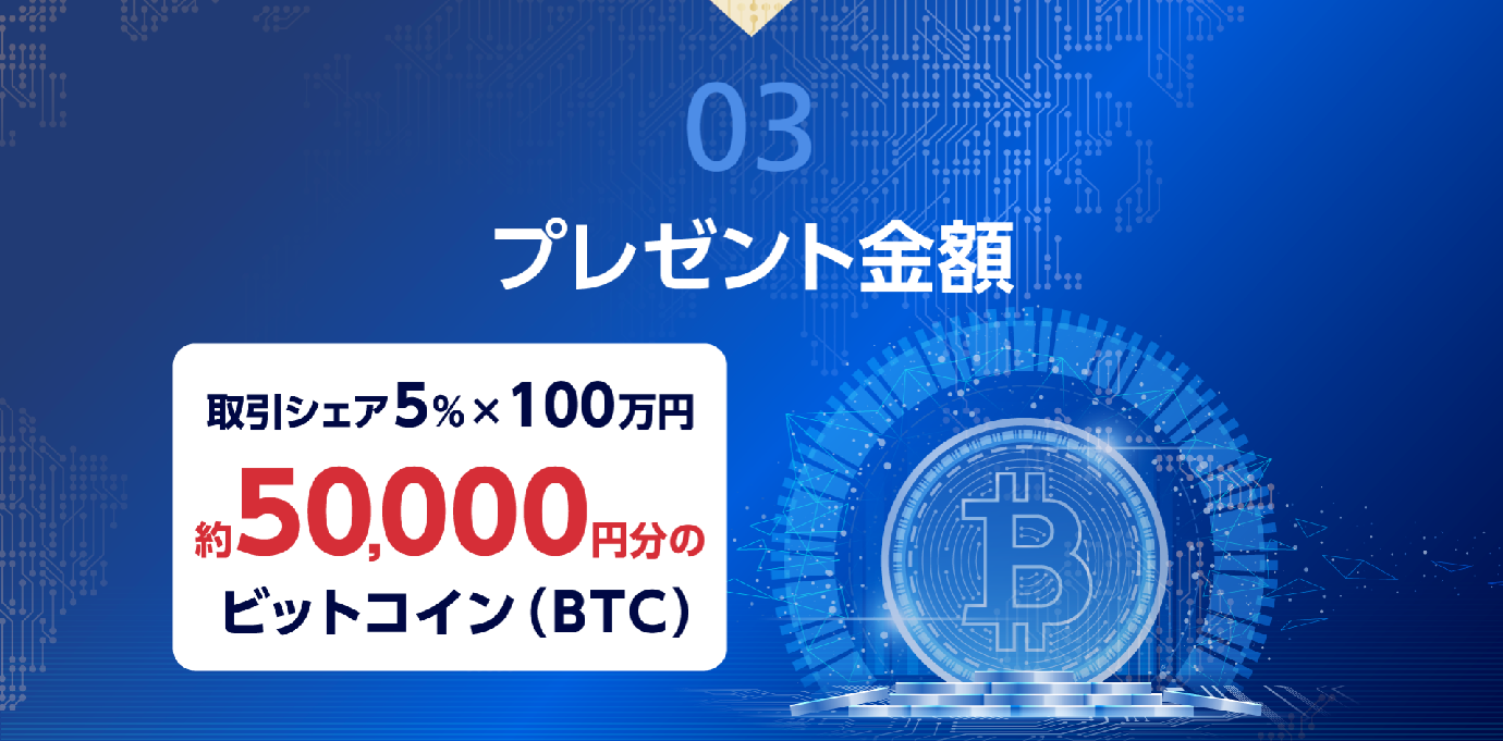 0.01 BTCを1口として、キャンペーン期間中に取引を行ったすべてのお客さまの合計口数に応じて、100万円分のビットコイン(BTC)を山分けします。