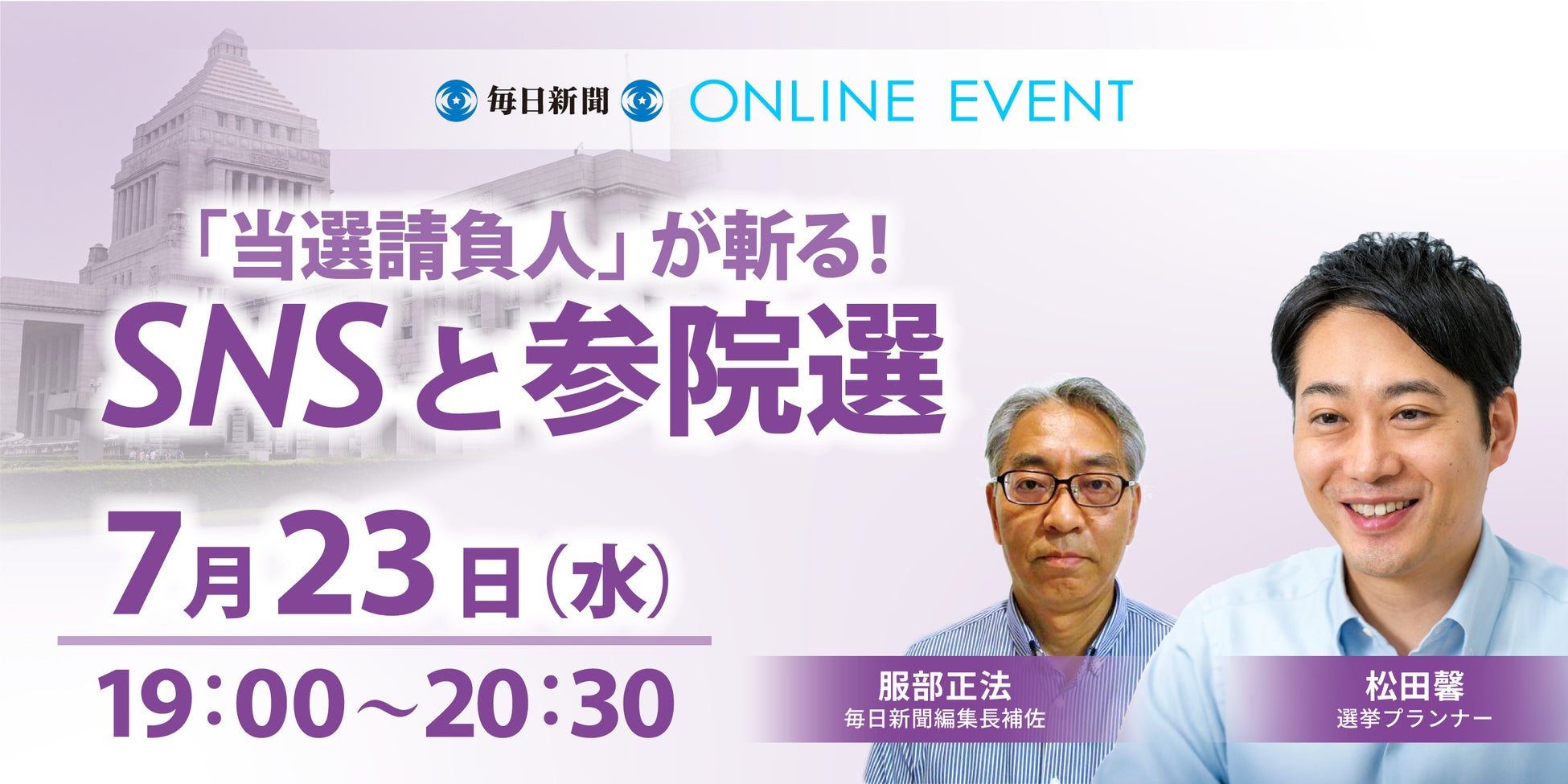 毎日新聞社(代表取締役社長:松木健)は7月23日(水)19時から、オンライントークイベント「『当選請負人』が斬る SNSと参院選」を開催します。