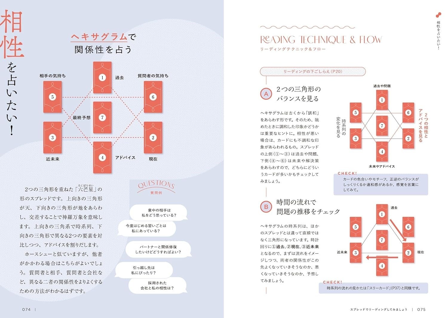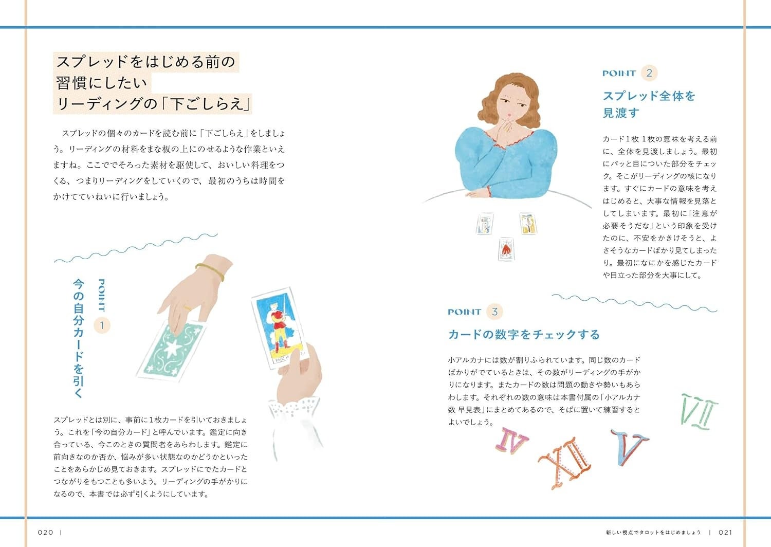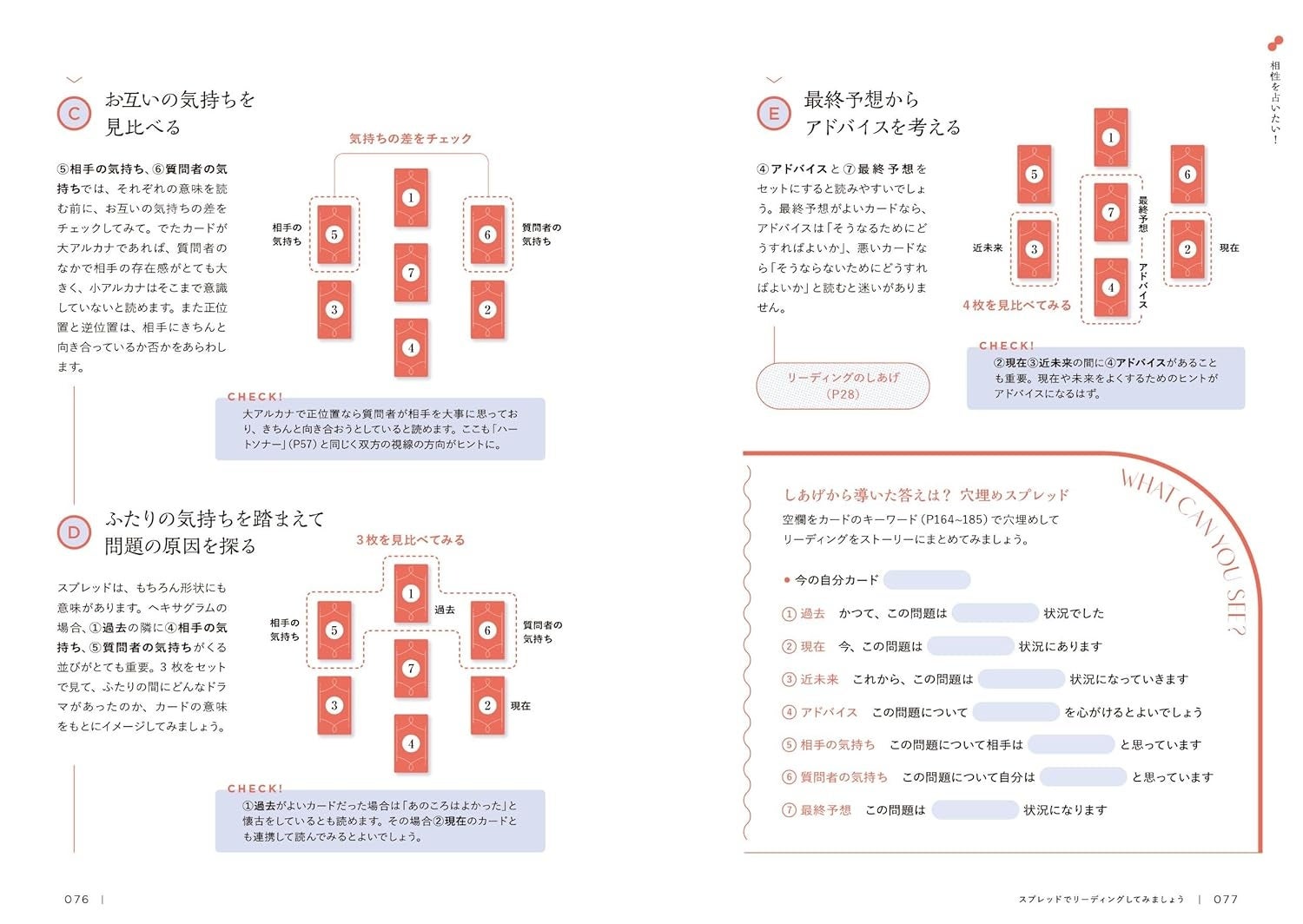 本書では、まるで料理やスイーツの作りかたの本のように、カードを並べるところからプロセスにして、順番にめくりながら、テクニックをつかうポイントやリーディングのコツがわかるようにしています。