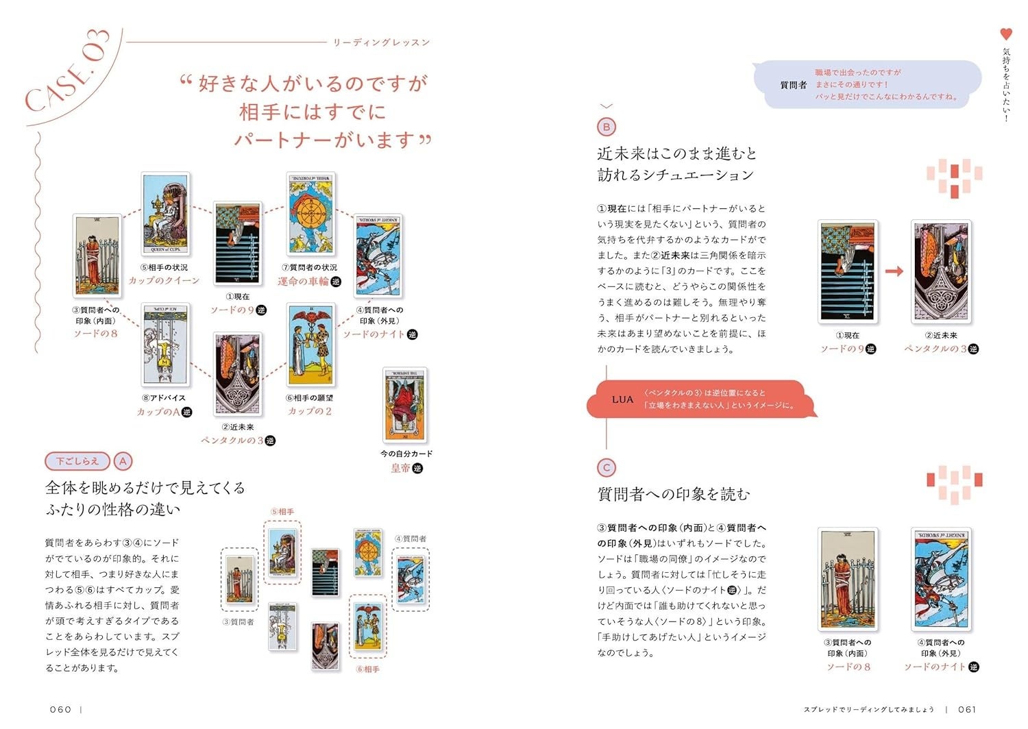 本書では、まずスプレッドごとにお料理レシピのようなフロー解説で基礎を掴んだあと、しっかりとケーススタディが学べるようになっているので、LUA氏におさらいしてもらっているような感覚でスキルが習得できます。